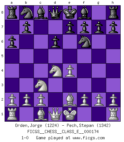 Last move : 1-0 2014 October 6 21:26:3 [Event "FICGS__CHESS__CLASS_E__000174"] [Site "FICGS"] [Date "2014.08.15"] [Round "1"] [White "Orden,Jorge"] [Black "Pech,Stepan"] [Result "1-0"] [WhiteElo "1224"] [BlackElo "1342"] 1.e4 c5 2.Nf3 d6 3.d4 cxd4 4.Nxd4 Nf6 5.Nc3 a6 6.Be2 1-0 This chess game has been lost on time (started : 2014.08.15 21:28:47) Sicilian : Najdorf, Opovcensky variation Player White won this chess game. Follow this game move after move (download)Fischer was a master of clarity and a king of artful positioning. His opponents would see where he was going but were powerless to stop him. (Bruce Pandolfini) Kein Schachspieler kann gut schlafen. (H. G. Wells) Cuando tengo las piezas blancas, yo gano porque soy blanco; Cuando tengo las piezas negras, yo gano porque soy Bogolyubov. (Bogolyubov) Aux échecs, l'amour-propre est satisfait quand on remporte la victoire, mais il n'y a pas de honte à être battu. (Benjamin Franklin) Wisdom is the reward you get for a lifetime of listening when you'd have preferred to talk. (Doug Larson)