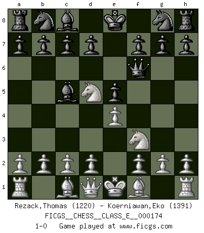 Last move : 1-0 2014 September 28 8:32:36 [Event "FICGS__CHESS__CLASS_E__000174"] [Site "FICGS"] [Date "2014.08.15"] [Round "1"] [White "Rezack,Thomas"] [Black "Koerniawan,Eko"] [Result "1-0"] [WhiteElo "1220"] [BlackElo "1391"] 1.e4 e5 2.Nf3 Qf6 3.Nc3 Bc5 4.Nd5 1-0 This chess game has been lost on time (started : 2014.08.15 21:28:47) Greco defense Player White won this chess game. Follow this game move after move (download)Dazzling combinations are for the many, shifting wood is for the few. (Georg Kieninger) Ich tröste mich mit dem Vergnügen, daß Schachfans, Zuschauer und Leser glücklich sind, wenn ein Großmeister etwas riskiert, statt nur Klötzchen zu schieben. (Mikhail Nekhemyevich Tal) Solo puedes ser bueno en el Ajedrez si amas al juego. (Bobby Fischer) Des combinaisons [dans le jeu d'échecs] pareilles à des mélodies. Je crois entendre pour ainsi dire la musique des coups... (Vladimir Nabokov) Perception is reality. (Immanuel Kant)