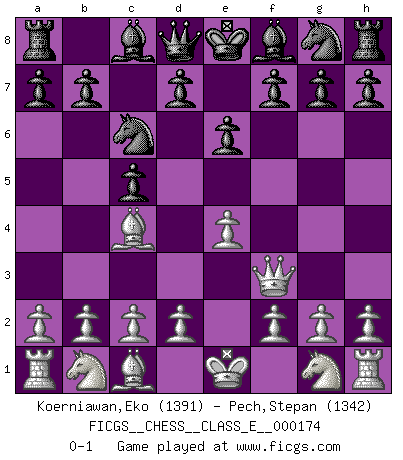 Last move : 0-1 2014 October 19 10:14:2 [Event "FICGS__CHESS__CLASS_E__000174"] [Site "FICGS"] [Date "2014.08.15"] [Round "1"] [White "Koerniawan,Eko"] [Black "Pech,Stepan"] [Result "0-1"] [WhiteElo "1391"] [BlackElo "1342"] 1.e4 c5 2.Qf3 Nc6 3.Bc4 e6 0-1 This chess game has been lost on time (started : 2014.08.15 21:28:47) Sicilian defense Player Black won this chess game. Follow this game move after move (download)War is the child of passion, passion is the child of narcissism and narcissism is the child. (...) Another game ? (Thibault de Vassal) Die Elozahlen sind sehr schlecht für das Schach. Jetzt ist Schach eine Sportindustrie, die darauf zielt Elopunkte zu machen. (Miguel Najdorf) Aquel que toma al Peón de Caballo de la Reina, se pasará la noche a dormir en la calle. (Anónimo) J'apprécie les joueurs d'est-indienne, c'est grâce à eux que je nourris ma famille depuis tant d'années. (Petrosian) He who defends everything defends nothing. (Frederick the Great)