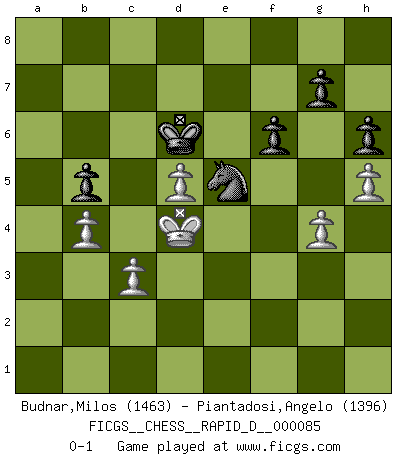 Last move : 0-1 2014 November 17 6:58:8 [Event "FICGS__CHESS__RAPID_D__000085"] [Site "FICGS"] [Date "2014.08.15"] [Round "1"] [White "Budnar,Milos"] [Black "Piantadosi,Angelo"] [Result "0-1"] [WhiteElo "1463"] [BlackElo "1396"] 1.e4 e6 2.d4 d5 3.Nc3 dxe4 4.Nxe4 Nd7 5.Bd3 Ngf6 6.Qe2 Be7 7.Nf3 O-O 8.O-O b6 9.Be3 Bb7 10.Bg5 Nxe4 11.Bxe4 Bxe4 12.Qxe4 Bxg5 13.Nxg5 Qxg5 14.Qc6 Nf6 15.Qxc7 Qd5 16.c3 Qd7 17.Qxd7 Nxd7 18.f4 Nf6 19.f5 exf5 20.Rxf5 Rfe8 21.Re5 Nd7 22.Rxe8+ Rxe8 23.Kf2 f6 24.b4 b5 25.a4 a6 26.axb5 axb5 27.Ra7 Nb6 28.Rb7 Re6 29.Rc7 h6 30.h4 Nc4 31.Rc5 Na3 32.g3 Kf7 33.d5 Rd6 34.g4 Kg6 35.h5+ Kh7 36.Kf3 Kg8 37.Kf4 Kf7 38.Rc7+ Kf8 39.Ke4 Nc4 40.Rc6 Ke7 41.Rxd6 Kxd6 42.Kd4 Ne5 0-1 French : Rubinstein variation Kingside Castling by player Black (move 7) Kingside Castling by player White (move 8) Player Black won this chess game. Follow this game move after move (download)I still hope to kill Fischer. (Boris Spassky) Im Spitzenschach von heute geht es nur um Vorbereitung, um tiefgründige, sorgfältige Eröffnungsvorbereitung. (Nigel Short) El Ajedrez es en su esencia, un juego. En su forma, un arte. Y en su ejecución, una ciencia. (Baron Tassilo) Même si l'adversaire joue le coup analysé précédemment, recommencez l'analyse en voyant la nouvelle position. Première règle de Blumenfeld Programmer - an organism that turns coffee into software. (Anonymous)