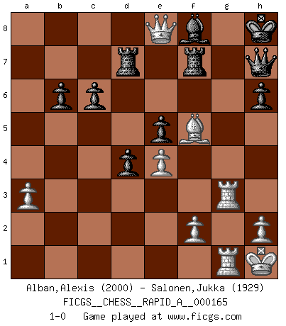 Last move : 1-0 2014 October 25 8:0:3 [Event "FICGS__CHESS__RAPID_A__000165"] [Site "FICGS"] [Date "2014.08.17"] [Round "1"] [White "Alban,Alexis"] [Black "Salonen,Jukka"] [Result "1-0"] [WhiteElo "2000"] [BlackElo "1929"] 1.d4 d5 2.c4 e6 3.Nc3 Nf6 4.Nf3 Be7 5.Bf4 O-O 6.e3 c5 7.dxc5 Bxc5 8.Qc2 Nc6 9.a3 Re8 10.Bg5 Be7 11.Be2 h6 12.Bh4 d4 13.Rd1 e5 14.O-O Bg4 15.Bxf6 Bxf6 16.b4 Bh5 17.Ne4 Bg6 18.Bd3 Bh5 19.c5 Bxf3 20.gxf3 Be7 21.Bc4 Bf8 22.Kh1 Qd7 23.Rg1 Qf5 24.Rg3 Rad8 25.Rdg1 Kh8 26.b5 Na5 27.Bf1 Re7 28.Bh3 Qh7 29.c6 bxc6 30.Qa4 f5 31.Qxa5 Rd5 32.Nf6 gxf6 33.Qa6 Rc7 34.b6 axb6 35.Qa8 Rf7 36.e4 fxe4 37.Qe8 f5 38.fxe4 R5d7 39.Bxf5 1-0 QGD : Classical variation (5.Bf4) Kingside Castling by player Black (move 5) Kingside Castling by player White (move 14) Player White won this chess game. Follow this game move after move (download)The blunders are all there on the board, waiting to be made. (Savielly Tartakover) Intelligenz läßt sich nicht am Weg, sondern nur am Ergebnis feststellen. (Garry Kasparov) No nos podemos resistir a la fascinación de un sacrificio ya que la pasión por los sacrificios es parte de la naturaleza de un jugador de Ajedrez. (Rudolf Spielman) Les pièces de l'échiquier étaient impitoyables. Elles le retenaient, elles l'absorbaient. Il y avait de l'horreur en cela, mais aussi une harmonie unique. Car, qu'y a-t-il dans le monde, à part les échecs ? (V. Nabokov) Excelling at chess has long been considered a symbol of more general intelligence. That is an incorrect assumption in my view, as pleasant as it might be. But for the purposes of argument and investigation, chess is, in Russkin-Gutman's words, 'an unparalleled laboratory, since both the learning process and the degree of ability obtained can be objectified and quantified, providing an excellent comparative framework on which to use rigorous analytical techniques.' (The Chess Master and the Computer, by Garry Kasparov - 2010)