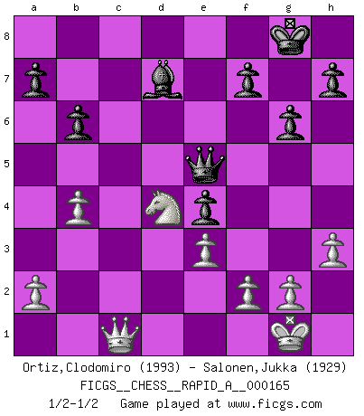 Last move : 1/2-1/2 2014 September 9 21:7:59 [Event "FICGS__CHESS__RAPID_A__000165"] [Site "FICGS"] [Date "2014.08.17"] [Round "1"] [White "Ortiz,Clodomiro"] [Black "Salonen,Jukka"] [Result "1/2-1/2"] [WhiteElo "1993"] [BlackElo "1929"] 1.d4 d5 2.c4 e6 3.Nf3 c6 4.Qc2 Nf6 5.e3 Nbd7 6.Nc3 Bd6 7.cxd5 cxd5 8.Bd3 e5 9.Nb5 Bb8 10.Nxe5 Nxe5 11.dxe5 Bxe5 12.Bd2 O-O 13.O-O Bd7 14.Bc3 Qe7 15.Bxe5 Qxe5 16.Nd4 Rac8 17.Qd2 Rc5 18.Rfc1 Rfc8 19.Rxc5 Rxc5 20.Rd1 g6 21.h3 b6 22.b4 Rc7 23.Rc1 Ne4 24.Qb2 Rxc1+ 25.Qxc1 Qg5 26.Nf3 Qf6 27.Bxe4 dxe4 28.Nd4 Qe5 1/2-1/2 Queen's gambit declined Kingside Castling by player Black (move 12) Kingside Castling by player White (move 13) This chess game ended in a draw. Follow this game move after move (download)It is no time to be playing Chess when the house is on fire. (Italian Proverb) Charakterschwächen offenbaren sich normalerweise während einer Schachpartie. (Garry Kasparov) El Ajedrez es un cuento de Hadas de las 1001 metidas de pata. (Savielly Tartakower) Le génie consiste à savoir transgresser les règles au moment opportun. (Teichmann) I've lost money so fast in these clubs it's left me reeling. I've read every poker book ever written, but the only way to get better at the game is to go out and play with people who are really good. The problem is, you stand to lose a lot of money doing it. (Matt Damon)