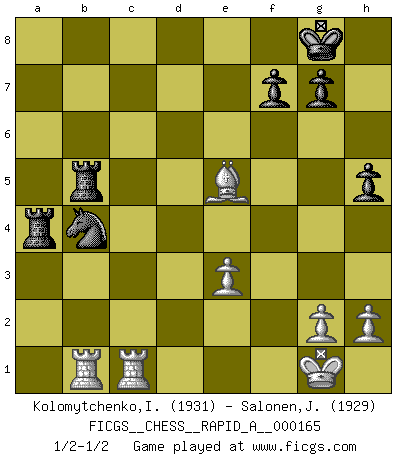 Last move : 1/2-1/2 2014 October 25 9:26:7 [Event "FICGS__CHESS__RAPID_A__000165"] [Site "FICGS"] [Date "2014.08.17"] [Round "1"] [White "Kolomytchenko,Igor"] [Black "Salonen,Jukka"] [Result "1/2-1/2"] [WhiteElo "1931"] [BlackElo "1929"] 1.e4 c5 2.Nf3 Nc6 3.d4 cxd4 4.Nxd4 e5 5.Nb5 d6 6.c4 Be7 7.Bd3 Nf6 8.O-O O-O 9.N1c3 a6 10.Na3 Be6 11.Nc2 Rc8 12.b3 b5 13.cxb5 Na7 14.Nd5 Nxb5 15.Nxe7+ Qxe7 16.Bb2 h5 17.a4 Na7 18.b4 Bb3 19.Qd2 Bxc2 20.Bxc2 Qb7 21.Bd3 Rb8 22.Rab1 Nxe4 23.Bxe4 Qxe4 24.Qxd6 Rfe8 25.Qxa6 Nc6 26.b5 Nb4 27.Qa7 Ra8 28.Qe3 Qxe3 29.fxe3 Rxa4 30.Rfc1 Rb8 31.Bxe5 Rxb5 1/2-1/2 Sicilian : Labourdonnais-Loewenthal (Kalashnikov) variation Kingside Castling by player White (move 8) Kingside Castling by player Black (move 8) This chess game ended in a draw. Follow this game move after move (download)Pawn endings are to Chess what putting is to golf. (Cecil Purdy) Wenn es im Universum noch irgendwo intelligente Lebewesen gibt, dann kennen sie Go. (Emanuel Lasker) Personalmente, yo prefiero mirar hacia el futuro en donde un programa de computadora gane el título mundial de Ajedrez. La humanidad necesita una lección de humildad. (Richard Dawkings) Il (Jacob Murray) ne joue pas pour le bon coup, mais pour le meilleur. (Eloi Relange) He who is a good ruler must first have been ruled. (Aristotle)