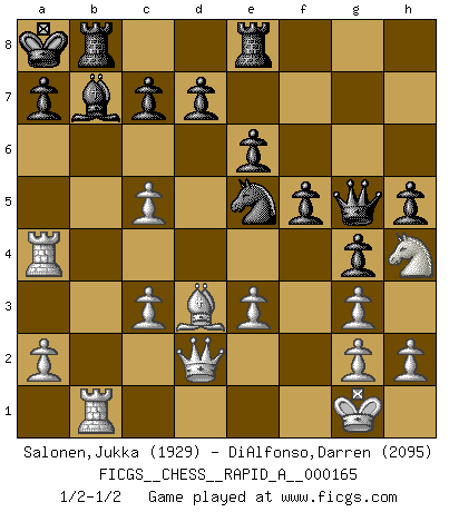 Last move : 1/2-1/2 2014 September 21 10:18:8 [Event "FICGS__CHESS__RAPID_A__000165"] [Site "FICGS"] [Date "2014.08.17"] [Round "1"] [White "Salonen,Jukka"] [Black "DiAlfonso,Darren"] [Result "1/2-1/2"] [WhiteElo "1929"] [BlackElo "2095"] 1.d4 Nf6 2.c4 e6 3.Nc3 Bb4 4.Nf3 b6 5.Bg5 Bb7 6.e3 h6 7.Bh4 g5 8.Bg3 Ne4 9.Qc2 Bxc3+ 10.bxc3 Nxg3 11.fxg3 g4 12.Nh4 Qg5 13.Qd2 Nc6 14.Bd3 O-O-O 15.O-O f5 16.Rf2 Kb8 17.Raf1 h5 18.Rf4 Rhe8 19.c5 bxc5 20.dxc5 Ka8 21.Rb1 Rb8 22.Ra4 Ne5 1/2-1/2 Nimzo-Indian : Three knights variation Queenside Castling by player Black (move 14) Kingside Castling by player White (move 15) This chess game ended in a draw. Follow this game move after move (download)The older I grow, the more I value pawns. (Paul Keres) Bobby Fischer ist kein Vorbild für die heutige Jugend. (Viktor Kortschnoi) Ciertamente el estado mental actual de Bobby Fischer es una tragedia. Uno de los mas grandes jugadores de Ajedrez del mundo -el orgullo y pena del Ajedrez Americano. (Frank Brady) Un millionnaire : 'Monsieur Steinitz ! Vous ne participez aux tournois que pour l'argent, alors que moi je n'y viens que pour l'honneur.' Steinitz : 'Chacun joue pour ce qu'il n'a pas'... It's not a bug - it's an undocumented feature. (Anonymous)