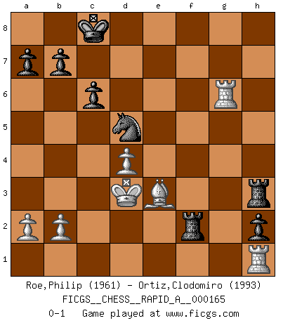Last move : 0-1 2014 October 16 4:9:47 [Event "FICGS__CHESS__RAPID_A__000165"] [Site "FICGS"] [Date "2014.08.17"] [Round "1"] [White "Roe,Philip"] [Black "Ortiz,Clodomiro"] [Result "0-1"] [WhiteElo "1961"] [BlackElo "1993"] 1.Nc3 d5 2.e4 d4 3.Nce2 Nc6 4.Ng3 Qd6 5.Nf3 h5 6.c3 d3 7.Qb3 h4 8.Nf5 Bxf5 9.exf5 O-O-O 10.Qxf7 Qf4 11.Bxd3 Rxd3 12.Qxf8+ Rd8 13.Qxg7 Qe4+ 14.Kd1 Nf6 15.Re1 Qd5 16.Qg5 h3 17.d4 Rdg8 18.Qe3 Rxg2 19.Bd2 Qxf5 20.Qe6+ Qxe6 21.Rxe6 Rxf2 22.Re3 Ng4 23.Re4 Rxf3 24.Rxg4 Rf1+ 25.Be1 Rh1 26.Ke2 e5 27.Kd3 exd4 28.cxd4 Nb4+ 29.Kc3 Nd5+ 30.Kd3 c6 31.Rc1 Rxh2 32.Bd2 Rf2 33.Rg3 h2 34.Rh1 Nf6 35.Rg6 Rh3+ 36.Be3 Nd5 0-1 Dunst (Sleipner, Heinrichsen) Opening Queenside Castling by player Black (move 9) Player Black won this chess game. Follow this game move after move (download)There are two types of sacrifices: correct ones and mine. (Mikhail Tal) Schach verlangt totale Konzentration. (Robert James Fischer) Todo lo que importa ante el tablero de Ajedrez son buenas jugadas. (Bobby Fischer) On croit qu'il y a plus de mauvais joueurs que de bons joueurs, c'est faux : Il y a autant de joueurs qui gagnent que de joueurs qui perdent. (Philippe Geluck) Secret operations are essential in war; upon them the army relies to make its every move. (Sun Tzu)