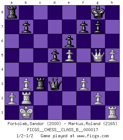Last move : 1/2-1/2 2007 August 7 21:4:54 [Event "FICGS__CHESS__CLASS_B__000017"] [Site "FICGS"] [Date "2007.02.21"] [Round "1"] [White "Porkolab,Sandor"] [Black "Markus,Roland"] [Result "1/2-1/2"] [WhiteElo "2000"] [BlackElo "2165"] 1.e4 c6 2.d4 d5 3.e5 Bf5 4.Be3 e6 5.Nd2 Nd7 6.Ngf3 Bg6 7.h4 h5 8.Nb3 Nh6 9.Bd3 Bxd3 10.Qxd3 Nf5 11.Bg5 Be7 12.Qd2 Rc8 13.O-O-O c5 14.Bxe7 Qxe7 15.dxc5 Nxc5 16.Nbd4 Nxd4 17.Nxd4 O-O 18.f3 Qc7 19.Qg5 Na4 20.Kb1 a5 21.Qxh5 Nxb2 22.Kxb2 Qc3+ 23.Kb1 Qb4+ 24.Nb3 a4 25.Qg5 axb3 26.cxb3 Rc3 27.Rd2 Ra8 28.Rb2 Qd4 29.h5 Qd3+ 1/2-1/2 Caro-Kann : Advance variation Queenside Castling by player White (move 13) Kingside Castling by player Black (move 17) This chess game ended in a draw. Follow this game move after move (download)Of all my Russian books, the defense contains and diffuses the greatest 'warmth' which may seem odd seeing how supremely abstract Chess is supposed to be. (Vladimir Nabokov) Der Traum, für den ich lebe, ist der von einem freien Russland. Viele mögen sagen: Russland hat doch ein Parlament, einen gewählten Präsidenten. Aber ich spüre, dass in meiner Heimat die Angst wiederkehrt. Eine Angst, sich frei zu äußern, bestimmte Dinge zu tun (Garry Kasparov) Con el fin de mejorar tu juego, debes de estudiar los finales antes que todo, ya que mientras que los finales pueden ser estudiados y dominados por sí mismos, el juegomedio y la apertura deben de ser estudiados en relación con los finales. (José Raúl Capablanca) Les erreurs sont comme les malheurs, elles n'arrivent jamais seules. (Siegbert Tarrasch) The problem with troubleshooting is that trouble shoots back. (Anonymous)