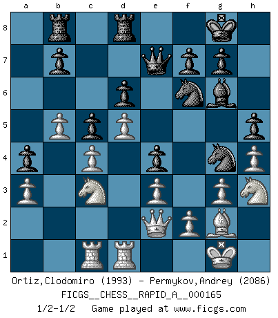 Last move : 1/2-1/2 2014 October 3 16:59:33 [Event "FICGS__CHESS__RAPID_A__000165"] [Site "FICGS"] [Date "2014.08.17"] [Round "1"] [White "Ortiz,Clodomiro"] [Black "Permykov,Andrey"] [Result "1/2-1/2"] [WhiteElo "1993"] [BlackElo "2086"] 1.c4 e5 2.Nc3 Nf6 3.g3 Bc5 4.Bg2 Nc6 5.Nf3 d6 6.e3 O-O 7.O-O Bb6 8.d4 Bf5 9.b3 Re8 10.d5 Ne7 11.Nd2 Ng6 12.Bb2 Nf8 13.b4 a5 14.a3 h5 15.h4 Qe7 16.Nde4 N8d7 17.Qe2 Ng4 18.Ng5 Ndf6 19.Nce4 Red8 20.Rac1 Nd7 21.Rfd1 Bg6 22.Rd2 Rab8 23.Rdc2 c5 24.b5 a4 25.Rd2 Nf8 26.R2d1 Ba5 27.Bc3 Bxc3 28.Nxc3 Nh7 29.Nh3 e4 30.Nf4 Nhf6 31.Nh3 1/2-1/2 English : Carls' Bremen system Kingside Castling by player Black (move 6) Kingside Castling by player White (move 7) This chess game ended in a draw. Follow this game move after move (download)The hardest game to win is a won game. (Emanuel Lasker) Privat ist Kortschnoi kein schlechter Mensch, sehr sympathisch. Aber während des Spiels ist er grausam. Er will dich töten. (Miguel Najdorf) ¡Examina movidas que hagan daño! Un buen ojo for movidas desvastantes es mucho mas importante que el conocimiento de principios estratégicos. (Purdy) Les échecs sont un jeu terrible. Si vous n'avez pas le centre, votre adversaire a une position plus libre. Par contre, si vous avez le centre, alors vous avez vraiment quelque chose pour laquelle vous inquiéter ! (Siegbert Tarrasch) Animated gif is worth one mega-word. (Unknown)