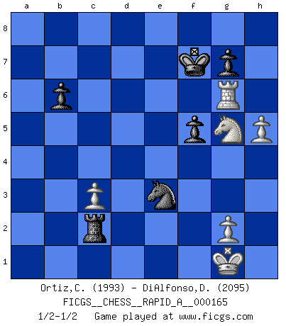 Last move : 1/2-1/2 2014 August 21 1:42:0 [Event "FICGS__CHESS__RAPID_A__000165"] [Site "FICGS"] [Date "2014.08.17"] [Round "1"] [White "Ortiz,Clodomiro"] [Black "DiAlfonso,Darren"] [Result "1/2-1/2"] [WhiteElo "1993"] [BlackElo "2095"] 1.c4 Nf6 2.Nc3 e5 3.Nf3 Nc6 4.d3 d5 5.cxd5 Nxd5 6.e4 Nxc3 7.bxc3 Bc5 8.Be2 O-O 9.Be3 Bxe3 10.fxe3 Qe7 11.O-O b6 12.d4 exd4 13.exd4 Qxe4 14.Qd2 Qd5 15.Bd3 Bf5 16.Qg5 Be4 17.Bxe4 Qxe4 18.Rae1 Qg6 19.Qxg6 hxg6 20.d5 Na5 21.Re7 Nc4 22.Nd4 f6 23.Nc6 Rae8 24.Rxc7 Rf7 25.Rxa7 Rxa7 26.Nxa7 Ra8 27.Nc6 Rxa2 28.Rd1 Nd6 29.Re1 Rd2 30.Nd4 f5 31.h4 Ne4 32.d6 Nxd6 33.Re6 Nc4 34.Rxg6 Kf7 35.h5 Ne3 36.Ne6 Ng4 37.Kf1 Ne3+ 38.Kg1 Rc2 39.Ng5+ 1/2-1/2 English Opening Kingside Castling by player Black (move 8) Kingside Castling by player White (move 11) This chess game ended in a draw. Follow this game move after move (download)When you don't know what to do, wait for your opponent to get an idea - it's sure to be wrong. (Tarrasch) Ich hatte meine größten Erfolge, als ich 47 Jahre alt war. Kasparow war noch nicht mal 42 und hat das Schach schon im Stich gelassen. (Viktor Kortschnoi) Bobby es la celebridad menos entendida y malinterpretada que camina el la faz de esta tierra. (Yasser Seirawan) Mon pion favori sur ma case favorite ! Bronstein en parlant d'un coup de pion en h5 quand il avait les Noirs. The message for business people contemplating their place in the cyberspace is simple and direct: get linked or get lost. (Vic Sussman and Kenan Pollack)