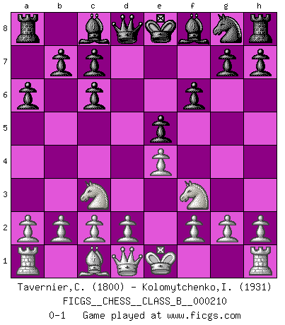 Last move : 0-1 2014 October 13 21:45:24 [Event "FICGS__CHESS__CLASS_B__000210"] [Site "FICGS"] [Date "2014.08.20"] [Round "1"] [White "Tavernier,Christopher"] [Black "Kolomytchenko,Igor"] [Result "0-1"] [WhiteElo "1800"] [BlackElo "1931"] 1.e4 e5 2.Nf3 Nc6 3.Bb5 a6 4.Bxc6 dxc6 5.Nc3 f6 0-1 This chess game has been lost on time (started : 2014.08.20 17:6:27) Ruy Lopez : Exchange, Keres variation Player Black won this chess game. Follow this game move after move (download)A thorough understanding of the typical mating continuations makes the most complicated sacrificial combinations leading up to them not only not difficult, but almost a matter of course. (Siegbert Tarrasch) Fallen sollten polizeilich verboten werden. (Savielly Grigorievitsch Tartakower) Si pudieramos observar el interior de la cabeza de un jugador de Ajedrez, encontraríamos ahí un mundo lleno de sentimientos, imágenes, ideas, emoción y pasión. (Alfred Binet) Celui qui prend des risques peut perdre, celui qui n'en prend pas perd toujours. (Xavier Tartacover) The beginning is the most important part of the work. (Plato)