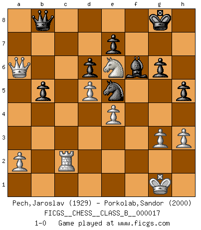 Last move : 1-0 2008 February 3 9:26:9 [Event "FICGS__CHESS__CLASS_B__000017"] [Site "FICGS"] [Date "2007.02.21"] [Round "1"] [White "Pech,Jaroslav"] [Black "Porkolab,Sandor"] [Result "1-0"] [WhiteElo "1929"] [BlackElo "2000"] 1.c4 Nf6 2.Nc3 g6 3.g3 Bg7 4.Bg2 O-O 5.Nf3 d6 6.O-O c5 7.d4 Nc6 8.d5 Na5 9.Nd2 a6 10.Qc2 Rb8 11.b3 b5 12.Bb2 bxc4 13.bxc4 Bh6 14.Ncb1 Bf5 15.e4 Bd7 16.Bc3 Ng4 17.Na3 Rb4 18.Nb3 Qc7 19.h3 Ne5 20.Bxb4 cxb4 21.f4 Ba4 22.fxe5 bxa3 23.e6 Bg7 24.exf7+ Rxf7 25.Rxf7 Kxf7 26.Qf2+ Kg8 27.Rf1 Nxc4 28.Nd4 Ne5 29.Ne6 Qb8 30.Qe3 Bb5 31.Rf2 Nd3 32.Rc2 Bf6 33.Bf1 Ne5 34.Bxb5 axb5 35.Qxa3 h5 36.Qa6 1-0 English Opening Kingside Castling by player Black (move 4) Kingside Castling by player White (move 6) Player White won this chess game. Follow this game move after move (download)The most powerful weapon in Chess is to have the next move. (David Bronstein) Ich organisiere ein großes Turnier, was mich etwa 120000 Dollar kostet. Ich denke, das ist das erste Mal in der Schachgeschichte, daß ein Schachgroßmeister auch als Mäzen auftritt. (Miguel Najdorf) La estratégia requiere pensar, la táctica requiere observación. (Max Euwe) Que feriez-vous si vous étiez en train de jouer aux échecs et que la fin du monde arrive ? Je continuerais à jouer. (Saint Borromée) Question: Is 'This statement is paradoxical' a paradoxical statement ? Or is it a meta-paradox ? (Normajean Yates)
