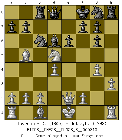 Last move : 0-1 2014 November 6 22:13:25 [Event "FICGS__CHESS__CLASS_B__000210"] [Site "FICGS"] [Date "2014.08.20"] [Round "1"] [White "Tavernier,Christopher"] [Black "Ortiz,Clodomiro"] [Result "0-1"] [WhiteElo "1800"] [BlackElo "1993"] 1.e4 c6 2.Nc3 d5 3.Nf3 Bg4 4.h3 Bh5 5.g4 Bg6 6.exd5 cxd5 7.Bb5+ Nc6 8.Ne5 Rc8 9.d4 e6 10.Qe2 Bd6 11.Nxg6 hxg6 12.Nxd5 Kf8 0-1 Caro-Kann : Two knights, 3...Bg4 Player Black won this chess game. Follow this game move after move (download)The most important feature of the Chess position is the activity of the pieces. This is absolutely fundamental in all phases of the game: Opening, Middlegame and especially Endgame. The primary constraint on a piece's activity is the Pawn structure. (Michael Stean) Rubinstein ist ein Turmendspiel, welches die Götter vor tausenden von Jahren begannen. (Savielly Grigorievitsch Tartakower) El estómago es una parte esencial del maestro de Ajedrez. (Bent Larsen) D'abord les bases : Jouez et étudiez, puis étudiez et jouez, ensuite jouez et étudiez, puis étudiez et jouez. Deuxièmement : Donnez toujours le meilleur de vous-même ! (Ken Smith) After growing wildly for years, the field of computing appears to be reaching its infancy. (John Pierce)