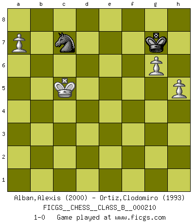 Last move : 1-0 2014 November 5 1:9:47 [Event "FICGS__CHESS__CLASS_B__000210"] [Site "FICGS"] [Date "2014.08.20"] [Round "1"] [White "Alban,Alexis"] [Black "Ortiz,Clodomiro"] [Result "1-0"] [WhiteElo "2000"] [BlackElo "1993"] 1.d4 Nf6 2.c4 e6 3.Nf3 c6 4.Bf4 d5 5.e3 Be7 6.Bd3 Nh5 7.Be5 Nd7 8.Nbd2 Nxe5 9.Nxe5 Nf6 10.Qc2 Nd7 11.Nef3 h6 12.O-O O-O 13.Rac1 a6 14.g3 b6 15.cxd5 exd5 16.Qxc6 Rb8 17.Qxd5 b5 18.a3 Bb7 19.Qf5 Nf6 20.e4 g6 21.Qf4 Kg7 22.Bb1 Bd6 23.Qe3 Re8 24.e5 Nd5 25.Qd3 Be7 26.e6 f5 27.Ne5 Nf6 28.f3 Qd5 29.Rfe1 Rbd8 30.Nf1 Qxd4+ 31.Qxd4 Rxd4 32.Bxf5 Bd8 33.Ne3 Bb6 34.Bxg6 Rd5 35.Bxe8 Rxe5 36.Bc6 Rxe3 37.Kf1 Bc8 38.Bxb5 Rxf3+ 39.Kg2 Rf2+ 40.Kh3 Bb7 41.Bc6 Bxc6 42.Rxc6 Rxb2 43.e7 Ne8 44.Rf1 Rf2 45.Rxf2 Bxf2 46.Rxa6 Kf7 47.Rxh6 Kxe7 48.a4 Be3 49.Rc6 Bd2 50.Rc2 Ba5 51.Rc5 Bc7 52.Rxc7+ Nxc7 53.a5 Ke6 54.g4 Kf6 55.Kg3 Ke5 56.h4 Kf6 57.h5 Ke5 58.g5 Ne6 59.a6 Kf5 60.g6 Kf6 61.a7 Nc7 62.Kf3 Kg7 63.Ke3 Nd5+ 64.Kd4 Nc7 65.Kc5 1-0 Queen's pawn game Kingside Castling by player White (move 12) Kingside Castling by player Black (move 12) 10 pieces endgame at move 46 : White KRPPPP , Black KBNP WHITE : King + 1 Rook 4 Pawns BLACK : King + 1 Bishop 1 Knight 1 Pawn 9 pieces endgame at move 47 : White KRPPPP , Black KBN WHITE : King + 1 Rook 4 Pawns BLACK : King + 1 Bishop 1 Knight 8 pieces endgame at move 47 : White KRPPP , Black KBN WHITE : King + 1 Rook 3 Pawns BLACK : King + 1 Bishop 1 Knight 7 pieces endgame at move 52 : White KRPPP , Black KN WHITE : King + 1 Rook 3 Pawns BLACK : King + 1 Knight 6 pieces endgame at move 52 : White KPPP , Black KN WHITE : King + 3 Pawns BLACK : King + 1 Knight Player White won this chess game. Follow this game move after move (download)Chess is everything: art, science and sport. (Anatoly Karpov) Ich glaube nicht an Psychologie, ich glaube an gute Züge. (Robert James Fischer) Los asuntos humanos son como una partida de Ajedrez: solo aquellos que no lo toman seriamente, pueden ser llamados buenos jugadores. (Hung Tzu Ch'eng) La menace est plus forte que l'exécution. (Aaron Nimzovitch) The real danger is not that computers will begin to think like men, but that men will begin to think like computers. (Sydney J. Harris)
