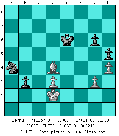Last move : 1/2-1/2 2015 February 11 22:4:50 [Event "FICGS__CHESS__CLASS_B__000210"] [Site "FICGS"] [Date "2014.08.20"] [Round "1"] [White "Fierry Fraillon,David"] [Black "Ortiz,Clodomiro"] [Result "1/2-1/2"] [WhiteElo "1800"] [BlackElo "1993"] 1.c4 Nf6 2.Nf3 c5 3.g3 d5 4.cxd5 Nxd5 5.Nc3 Nc6 6.Bg2 Nxc3 7.bxc3 e5 8.d3 Be7 9.O-O O-O 10.Rb1 Rb8 11.Nd2 Qc7 12.Nc4 b5 13.Ne3 Be6 14.Nd5 Qd7 15.Nxe7+ Nxe7 16.Qc2 b4 17.f4 exf4 18.Bxf4 Rbc8 19.Qb2 a5 20.Rbc1 Rfe8 21.Bd2 f6 22.Be4 Nc6 23.Rf4 Ne5 24.Re1 Red8 25.Be3 Re8 26.Bd2 Rcd8 27.Qc2 Ng6 28.Rf2 Ne5 29.Rf4 Bd5 30.cxb4 Bxe4 31.Rxe4 cxb4 32.Rc1 h6 33.Qc7 Qh3 34.Rh4 Qf5 35.Rf4 Qh5 36.Re4 Ng4 37.h4 Kh7 38.Rc5 f5 39.Qf4 Rxe4 40.dxe4 Nf6 41.Kf1 Qg6 42.exf5 Qe8 43.Be1 a4 44.Rc1 b3 45.axb3 axb3 46.Rb1 Rb8 47.Rb2 Rb5 48.Qf3 Qd7 49.Kg2 Rxf5 50.Qd3 Qxd3 51.exd3 Rb5 52.Bf2 Kg6 53.Bd4 h5 54.Rb1 Nd7 55.Kf3 Nb6 56.Ke2 Na4 57.Kd2 Rb7 58.Rf1 Rd7 59.Be5 Rd5 60.Bc3 Rd7 61.Be5 Rd5 62.Bc3 Rc5 63.Rc1 Kf7 64.Rf1+ Kg8 65.Rc1 g6 66.Bd4 Rxc1 67.Kxc1 Kf7 68.Kd2 Ke6 1/2-1/2 English Opening Kingside Castling by player White (move 9) Kingside Castling by player Black (move 9) 10 pieces endgame at move 67 : White KBPPP , Black KNPPP WHITE : King + 1 Bishop 3 Pawns BLACK : King + 1 Knight 3 Pawns This chess game ended in a draw. Follow this game move after move (download)Play the opening like a book, the middle game like a magician, and the endgame like a machine. (Spielmann) Die Partien sind immer verschieden, die Interviews immer die gleichen. (Garry Kasparov) El Ajedrez no es una pizca de inferior al violín, y tenemos un gran número de violinistas profesionales. (Mikhail Botvinnik) Mon pion favori sur ma case favorite ! Bronstein en parlant d'un coup de pion en h5 quand il avait les Noirs. God, you are such an idiot. - Actually, I thought I was more of a jerk. (Gregory House to Stacy Warner, House M.D.)