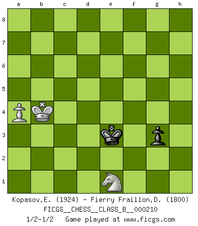 Last move : 1/2-1/2 2015 August 26 9:48:56 [Event "FICGS__CHESS__CLASS_B__000210"] [Site "FICGS"] [Date "2014.08.20"] [Round "1"] [White "Kopasov,Evgeny"] [Black "Fierry Fraillon,David"] [Result "1/2-1/2"] [WhiteElo "1924"] [BlackElo "1800"] 1.d4 Nf6 2.c4 g6 3.Nc3 d5 4.cxd5 Nxd5 5.Na4 Bg7 6.e4 Nb6 7.Nf3 Bg4 8.Be3 O-O 9.Nc5 Qc8 10.Qb3 Bxf3 11.gxf3 Rd8 12.h4 Nc6 13.d5 Nd4 14.Qd1 e5 15.Bh3 Qb8 16.Rc1 c6 17.Bxd4 exd4 18.dxc6 bxc6 19.Nd3 Qb7 20.h5 Rab8 21.hxg6 hxg6 22.b3 Nd7 23.Bxd7 Qxd7 24.f4 c5 25.Rc4 Rdc8 26.Kf1 Qb7 27.f3 Rc6 28.Qc2 Rbc8 29.Rg1 a5 30.Rg5 Qa6 31.Kg2 Bf8 32.Rg3 Bg7 33.f5 gxf5 34.exf5 Qb6 35.Nf4 Rh6 36.Rxd4 Kh8 37.Rd7 Qf6 38.Nh3 Rh5 39.Nf2 Re8 40.Qc4 Rxf5 41.Qg4 Bh6 42.Rd6 Qxd6 43.Qxf5 Rg8 44.Rxg8+ Kxg8 45.Ne4 Qg6+ 46.Qxg6+ fxg6 47.Nxc5 Kf7 48.Kg3 Kf6 49.Nb7 Bd2 50.Nd6 Bb4 51.Nc4 Kf5 52.Kf2 g5 53.Ke3 Bc5+ 54.Kd3 Kf4 55.Ke2 Bb4 56.Nb2 Ke5 57.Ke3 Bc5+ 58.Kd3 Be7 59.a4 Bd8 60.Nc4+ Kf4 61.Ke2 Bc7 62.Ne3 Bd6 63.Ng2+ Ke5 64.Kd3 Bc5 65.Kc4 Bd6 66.Kb5 Bb4 67.Ne3 Kf4 68.Nd5+ Kxf3 69.Nxb4 g4 70.Nd3 g3 71.b4 Ke3 72.Ne1 axb4 73.Kxb4 1/2-1/2 King's Indian defense, 3.Nc3 Kingside Castling by player Black (move 8) 10 pieces endgame at move 46 : White KNPPP , Black KBPPP WHITE : King + 1 Knight 3 Pawns BLACK : King + 1 Bishop 3 Pawns 9 pieces endgame at move 47 : White KNPPP , Black KBPP WHITE : King + 1 Knight 3 Pawns BLACK : King + 1 Bishop 2 Pawns 8 pieces endgame at move 68 : White KNPP , Black KBPP WHITE : King + 1 Knight 2 Pawns BLACK : King + 1 Bishop 2 Pawns 7 pieces endgame at move 69 : White KNPP , Black KPP WHITE : King + 1 Knight 2 Pawns BLACK : King + 2 Pawns 6 pieces endgame at move 72 : White KNP , Black KPP WHITE : King + 1 Knight 1 Pawn BLACK : King + 2 Pawns 5 pieces endgame at move 73 : White KNP , Black KP WHITE : King + 1 Knight 1 Pawn BLACK : King + 1 Pawn This chess game ended in a draw. Follow this game move after move (download)Chess is imagination. (David Bronstein) Ohne Fehler kann es keine Brillanz geben. (Emanuel Lasker) Personalmente, yo prefiero mirar hacia el futuro en donde un programa de computadora gane el título mundial de Ajedrez. La humanidad necesita una lección de humildad. (Richard Dawkings) Une platitude souvent récitée à propos des Echecs est qu'une des choses les plus difficiles à réaliser est de gagner une position gagnante. Cela ne manque pas de sens mais, pour ma part, j'ai toujours trouvé plus difficile de gagner une position perdante. (Tim Krabbe) Patience, use the Force, think ! (Obi-Wan Kenobi in Star Wars ep.2)