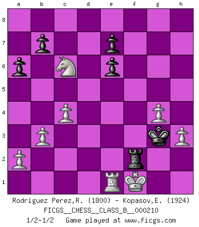 Last move : 1/2-1/2 2014 October 21 19:19:9 [Event "FICGS__CHESS__CLASS_B__000210"] [Site "FICGS"] [Date "2014.08.20"] [Round "1"] [White "Rodriguez Perez,Rene"] [Black "Kopasov,Evgeny"] [Result "1/2-1/2"] [WhiteElo "1800"] [BlackElo "1924"] 1.e4 c5 2.Nf3 d6 3.d4 cxd4 4.Qxd4 Nc6 5.Bb5 Bd7 6.Bxc6 Bxc6 7.c4 Nf6 8.Nc3 g6 9.O-O Bg7 10.Qd3 O-O 11.Nd4 Rc8 12.Rd1 Nd7 13.Be3 Nc5 14.Qc2 a6 15.Rac1 Qa5 16.Qd2 Rfe8 17.f3 Ne6 18.Nxe6 fxe6 19.Bd4 Bxd4+ 20.Qxd4 Red8 21.h3 Be8 22.Kh1 Rd7 23.e5 Qxe5 24.Qxe5 dxe5 25.Rxd7 Bxd7 26.b3 Bc6 27.Kg1 Rd8 28.Re1 Rd3 29.Ne4 Kf7 30.Ng5+ Kf6 31.Nxh7+ Kf5 32.g4+ Kf4 33.Nf8 Kxf3 34.Nxg6 Rd2 35.Nxe5+ Kg3 36.Nxc6 Rg2+ 37.Kf1 Rf2+ 1/2-1/2 Sicilian, Chekhover variation Kingside Castling by player White (move 9) Kingside Castling by player Black (move 10) This chess game ended in a draw. Follow this game move after move (download)Everything is in a state of flux, and this includes the world of Chess. (Mikhail Botvinnik) Rauchen ist dem Schachspieler bei seiner Arbeit, also im Wettkampf, untersagt. (Viktor Kortschnoi) Fischer es una tragedia del Ajedrez Americano a la par con Morphy y Pillsbury. (Mig Greengard) Dieu déplace le joueur, et celui-ci la pièce. Quel Dieu derrière Dieu commence donc la trame ? Arturo Perez-Reverte (prix de littérature policière 1993). I don't know, I don't care, and it doesn't make any difference. (Albert Einstein)