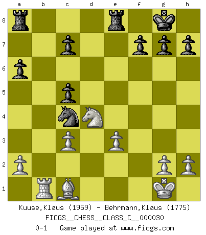 Last move : 0-1 2007 March 31 12:45:56 [Event "FICGS__CHESS__CLASS_C__000030"] [Site "FICGS"] [Date "2007.02.21"] [Round "1"] [White "Kuuse,Klaus"] [Black "Behrmann,Klaus"] [Result "0-1"] [WhiteElo "1959"] [BlackElo "1775"] 1.c4 e5 2.Nc3 Nf6 3.Nf3 Nc6 4.d4 e4 5.Nd2 Bb4 6.e3 Bxc3 7.bxc3 d6 8.Be2 O-O 9.O-O Qe7 10.f3 exf3 11.Nxf3 Bf5 12.Bd3 Bxd3 13.Qxd3 Qe4 14.Qxe4 Nxe4 15.Bb2 Na5 16.c5 Nc4 17.Bc1 dxc5 18.dxc5 Rfe8 19.Rb1 Nxc5 20.Nd4 a6 21.Rf5 b6 22.Rxc5 bxc5 0-1 English Opening Kingside Castling by player Black (move 8) Kingside Castling by player White (move 9) Player Black won this chess game. Follow this game move after move (download)Personally, I rather look forward to a computer program winning the world Chess Championship. Humanity needs a lesson in humility. (Richard Dawkings) Der Partner hat auch seine Existenzberechtigung. (Savielly Grigorievitsch Tartakower) Los finales de Peón son del Ajedrez lo que el cesped es del Golf. (Cecil Purdy) Celui qui prend des risques peut perdre, celui qui n'en prend pas perd toujours. (Xavier Tartacover) However beautiful the strategy, you should occasionally look at the results. (Winston Churchill)