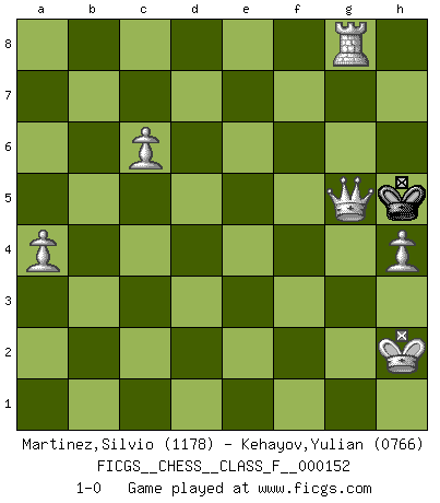 Last move : 1-0 2014 December 21 14:59:53 [Event "FICGS__CHESS__CLASS_F__000152"] [Site "FICGS"] [Date "2014.08.31"] [Round "1"] [White "Martinez,Silvio"] [Black "Kehayov,Yulian"] [Result "1-0"] [WhiteElo "1178"] [BlackElo "0766"] 1.e4 e5 2.Nf3 d6 3.d4 Nc6 4.d5 Nce7 5.Bb5+ c6 6.dxc6 bxc6 7.Ba4 Nf6 8.Nc3 Bd7 9.O-O g6 10.h3 Bg7 11.Re1 O-O 12.b4 d5 13.exd5 cxd5 14.Nxe5 Bxa4 15.Nxa4 Nd7 16.Rb1 Nxe5 17.Bb2 N7c6 18.b5 Ne7 19.Bxe5 Bxe5 20.Rxe5 Rb8 21.Qd3 Nf5 22.Rxd5 Qf6 23.Nc5 Rfd8 24.Nd7 Qe6 25.g4 Ne7 26.Nf6+ Qxf6 27.Rxd8+ Rxd8 28.Qxd8+ Kg7 29.Re1 Nd5 30.Qxd5 Qb6 31.Qe5+ Kg8 32.c4 a6 33.Qe8+ Kg7 34.Qe5+ Kg8 35.Kg2 axb5 36.c5 Qc6+ 37.Kg3 b4 38.Qb8+ Kg7 39.Qxb4 Qd5 40.a4 h5 41.gxh5 Qxh5 42.Qd4+ Kh7 43.c6 Qg5+ 44.Kh2 Qa5 45.Re7 Qf5 46.Re8 Qxf2+ 47.Qxf2 Kg7 48.Qb2+ Kh6 49.Qh8+ Kg5 50.h4 Kg4 51.Qg7 Kf5 52.Qxf7+ Kg4 53.Qxg6+ Kf4 54.Qf6+ Kg4 55.Rg8+ Kh5 56.Qg5+ 1-0 Philidor's defense Kingside Castling by player White (move 9) Kingside Castling by player Black (move 11) 10 pieces endgame at move 46 : White KQRPPP , Black KQPP WHITE : King + 1 Queen 1 Rook 3 Pawns BLACK : King + 1 Queen 2 Pawns 9 pieces endgame at move 47 : White KQRPPP , Black KPP WHITE : King + 1 Queen 1 Rook 3 Pawns BLACK : King + 2 Pawns 8 pieces endgame at move 52 : White KQRPPP , Black KP WHITE : King + 1 Queen 1 Rook 3 Pawns BLACK : King + 1 Pawn 7 pieces endgame at move 53 : White KQRPPP , Black K WHITE : King + 1 Queen 1 Rook 3 Pawns BLACK : King + Player White won this chess game. Follow this game move after move (download)Bobby just drops the pieces and they fall on the right squares. (Miguel Najdorf) Der Schachmeister von Heute braucht Courage, einen Killerinstinkt, Ausdauer und Arroganz. (Larry Evans) De todos mis libros Rusos, la defensa contiene y difunde el 'calor' mas grande que pudiese verse extraño al observar lo supremamente abstracto que el Ajedrez supuestamente es. (Vladimir Nabokov) Ce n'est pas pour s'amuser qu'il joue aux échecs : il célèbre un culte. (Vladimir Nabokov) If you are good, you will be assigned all the work. If you are really good, you will get out of it. (Dan Rotaru)