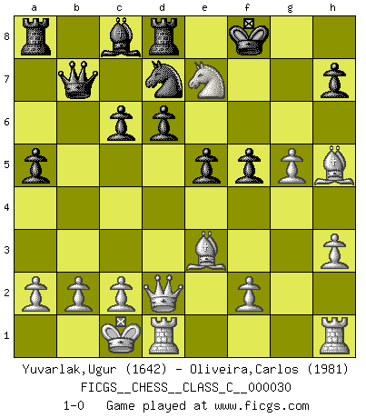 Last move : 1-0 2007 May 14 22:34:4 [Event "FICGS__CHESS__CLASS_C__000030"] [Site "FICGS"] [Date "2007.02.21"] [Round "1"] [White "Yuvarlak,Ugur"] [Black "Oliveira,Carlos"] [Result "1-0"] [WhiteElo "1642"] [BlackElo "1981"] 1.d4 d6 2.e4 c6 3.Nc3 Qc7 4.Nf3 e5 5.Be3 Nf6 6.h3 Nbd7 7.Qd2 Be7 8.O-O-O O-O 9.g4 Re8 10.g5 Nh5 11.d5 a5 12.Be2 g6 13.Nh2 Ng7 14.Ng4 f5 15.Nh6+ Kf8 16.exf5 Nxf5 17.Nxf5 gxf5 18.Bh5 Rd8 19.dxc6 bxc6 20.Nd5 Qb7 21.Nxe7 1-0 Queen's Pawn Queenside Castling by player White (move 8) Kingside Castling by player Black (move 8) Player White won this chess game. Follow this game move after move (download)Chess is a more highly symbolic game, but the aggressions are therefore even more frankly represented in the play. It probably began as a war game; that is, the representation of a miniature battle between the forces of two kingdoms. (Karl Meninger) Frage: Was machen Sie mit den Preisen? Anwort: Ich habe Angst, dass meine Freundin davon neue Kleider kauft. (Loek van Wely) Aunque la mayoría de la gente disfruta observar las partidas de los grandes Maestros de ataque, algunos de los jugadores mas notables en la historia han sido los jugadores silenciosos posicionales. Lentamente ellos te aplastan despojandote de tu espacio, congestionando tus piezas y dejandote virtualmente sin nada que hacer. (Yasser Seirawan) 'L'échange des dames est un coup dur pour les deux adversaires...' Un journaliste lors d'une partie du match Spassky-Fischer Follow your passion, and success will follow you. (Arthur Buddhold)