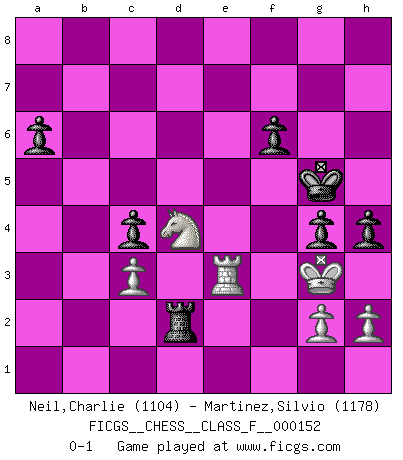 Last move : 0-1 2014 December 16 0:25:57 [Event "FICGS__CHESS__CLASS_F__000152"] [Site "FICGS"] [Date "2014.08.31"] [Round "1"] [White "Neil,Charlie"] [Black "Martinez,Silvio"] [Result "0-1"] [WhiteElo "1104"] [BlackElo "1178"] 1.e4 e5 2.Nf3 Nc6 3.Bb5 d6 4.d4 a6 5.Bxc6+ bxc6 6.O-O Nf6 7.dxe5 dxe5 8.Qxd8+ Kxd8 9.Bg5 Be7 10.Nc3 c5 11.Rad1+ Bd7 12.Nxe5 Ke8 13.Bxf6 Bxf6 14.Nxd7 Bxc3 15.bxc3 c4 16.Ne5 f6 17.Nxc4 Rb8 18.Rb1 Ke7 19.Rxb8 Rxb8 20.Rd1 g6 21.Na5 Rb6 22.Nc4 Rc6 23.Rd4 h5 24.f4 Re6 25.Kf2 c5 26.Rd2 Rxe4 27.Ne3 Rxf4+ 28.Kg3 Ra4 29.Nd5+ Kf7 30.Nc7 Rxa2 31.Rd7+ Kg8 32.Ne6 Rxc2 33.Rd3 c4 34.Rf3 Kf7 35.Nd4 Rd2 36.Re3 g5 37.Kf3 Kg6 38.Nc6 g4 39.Kg3 Kg5 40.Nd4 h4 0-1 Ruy Lopez : Old Steinitz defense Kingside Castling by player White (move 6) Player Black won this chess game. Follow this game move after move (download)A thorough understanding of the typical mating continuations makes the most complicated sacrificial combinations leading up to them not only not difficult, but almost a matter of course. (Siegbert Tarrasch) Ein Teil des Fehlers ist immer korrekt. (Savielly Grigorievitsch Tartakower) El Ajedrez moderno está demasiado preocupado con cosas como la estructura de Peones. Olvidenlo, el Jaque Mate termina la partida. (Nigel Short) Donnez-moi un Cavalier en 6e et je gagnerais toutes mes parties. (Steinitz) Luck is the residue of design. (John Milton)