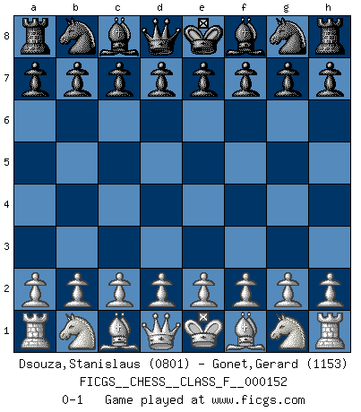 Last move : 0-1 2014 October 10 21:34:40 [Event "FICGS__CHESS__CLASS_F__000152"] [Site "FICGS"] [Date "2014.08.31"] [Round "1"] [White "Dsouza,Stanislaus"] [Black "Gonet,Gerard"] [Result "0-1"] [WhiteElo "0801"] [BlackElo "1153"] 0-1 This chess game has been lost on time (started : 2014.08.31 13:2:13) Player Black won this chess game. Follow this game move after move (download)A bad plan is better than none at all. (Frank Marshall) Wenn Du einsam bist, wenn Du Dich in der Welt wie ein Fremder fühlst, spiele Schach. Das wird Deinen Geist erheben und Dein Ratgeber im Kampf sein. (Aristoteles) La pasion por jugar al Ajedrez es una de las mas inexplicables en el mundo. (H.G. Wells) 'L'échange des dames est un coup dur pour les deux adversaires...' Un journaliste lors d'une partie du match Spassky-Fischer Knowledge will give you power, but character respect. (Bruce Lee)