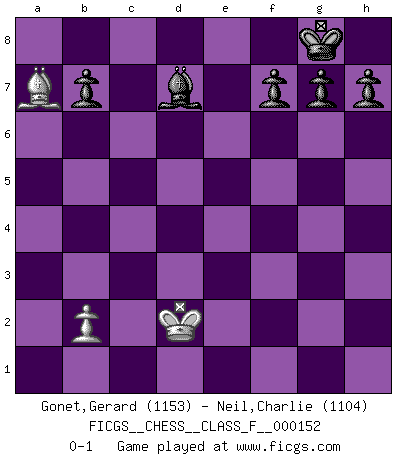 Last move : 0-1 2014 September 17 14:12:19 [Event "FICGS__CHESS__CLASS_F__000152"] [Site "FICGS"] [Date "2014.08.31"] [Round "1"] [White "Gonet,Gerard"] [Black "Neil,Charlie"] [Result "0-1"] [WhiteElo "1153"] [BlackElo "1104"] 1.d4 Nf6 2.f3 d5 3.e4 dxe4 4.Nc3 exf3 5.Qxf3 Qxd4 6.Be3 Qd8 7.h3 e5 8.Bd3 Bb4 9.Nge2 e4 10.Bxe4 Nxe4 11.Qxe4+ Qe7 12.O-O-O Bxc3 13.Nxc3 Qxe4 14.Rhe1 Bf5 15.Nxe4 O-O 16.Ng3 Bg6 17.Bf4 Na6 18.Rd7 Nb4 19.Re2 Nxa2+ 20.Kb1 Nb4 21.Rxc7 Rfc8 22.Ne4 Rxc7 23.Bxc7 Rc8 24.Bd6 Rxc2 25.Rxc2 Nxc2 26.Kxc2 Bxe4+ 27.Kd2 Bxg2 28.Bc5 Bxh3 29.Bxa7 Bd7 0-1 Blackmar-Diemer gambit Queenside Castling by player White (move 12) Kingside Castling by player Black (move 15) 10 pieces endgame at move 28 : White KBP , Black KBPPPPP WHITE : King + 1 Bishop 1 Pawn BLACK : King + 1 Bishop 5 Pawns 9 pieces endgame at move 29 : White KBP , Black KBPPPP WHITE : King + 1 Bishop 1 Pawn BLACK : King + 1 Bishop 4 Pawns Player Black won this chess game. Follow this game move after move (download)We cannot resist the fascination of sacrifice, since a passion for sacrifices is part of a Chessplayer's nature. (Rudolf Spielman) Kritik überlasse ich den Spießern. Ich zeige nichts, wofür ich mich schämen muss. (Alexandra Kosteniuk) El Peón aislado arroja penumbra sobre todo el tablero. (Aaron Nimzovich) Toute estimation doit être constamment réévaluée. (Jacob Estrin) History is the quarrels of popes and kings, with wars or pestilences in every page; the men all so good for nothing, and hardly any women at all. (Jane Austen)