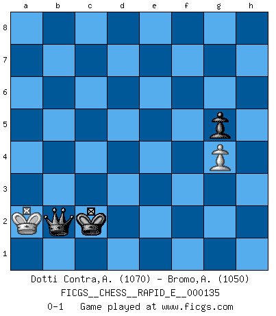 Last move : 0-1 2015 January 4 22:1:0 [Event "FICGS__CHESS__RAPID_E__000135"] [Site "FICGS"] [Date "2014.08.31"] [Round "1"] [White "Dotti Contra,Alessandro"] [Black "Bromo,Alexis"] [Result "0-1"] [WhiteElo "1070"] [BlackElo "1050"] 1.e4 e5 2.Nf3 Nc6 3.Bb5 d6 4.O-O Bd7 5.Nc3 Nf6 6.d4 a6 7.Bc4 h6 8.dxe5 Nxe5 9.Nxe5 dxe5 10.Re1 Bb4 11.h3 b5 12.Nd5 Bxe1 13.Qxe1 bxc4 14.f3 Bc6 15.Nxf6+ Qxf6 16.Bd2 O-O 17.Ba5 Qe7 18.Bb4 Qf6 19.Bxf8 Rxf8 20.Rd1 Rd8 21.Rxd8+ Qxd8 22.c3 Bb5 23.Qf1 Qd2 24.Qb1 Ba4 25.b3 cxb3 26.axb3 Qe3+ 27.Kh2 Bc6 28.c4 Qf4+ 29.Kh1 a5 30.Qc2 Bd7 31.Qc3 a4 32.bxa4 Bxa4 33.c5 Kh7 34.Qe1 c6 35.Qf2 Qc1+ 36.Qg1 Qxg1+ 37.Kxg1 Kg6 38.Kf2 Bb5 39.Ke3 Kf6 40.f4 exf4+ 41.Kxf4 g5+ 42.Ke3 Ke5 43.g3 f5 44.exf5 Kxf5 45.g4+ Ke5 46.Kf3 Kd5 47.Kg3 Kxc5 48.h4 Kd5 49.hxg5 hxg5 50.Kf3 c5 51.Ke3 c4 52.Kd2 Kd4 53.Kc2 Ba4+ 54.Kc1 Kc3 55.Kb1 Kd2 56.Kb2 c3+ 57.Ka3 c2 58.Kxa4 c1Q 59.Kb4 Qc6 60.Ka5 Kd3 61.Kb4 Qb6+ 62.Ka3 Qb5 63.Ka2 Qb4 64.Ka1 Kc2 65.Ka2 Qb2+ 0-1 Ruy Lopez : Old Steinitz defense Kingside Castling by player White (move 4) Kingside Castling by player Black (move 16) 10 pieces endgame at move 44 : White KPPPP , Black KBPPP WHITE : King + 4 Pawns BLACK : King + 1 Bishop 3 Pawns 9 pieces endgame at move 44 : White KPPP , Black KBPPP WHITE : King + 3 Pawns BLACK : King + 1 Bishop 3 Pawns 8 pieces endgame at move 47 : White KPP , Black KBPPP WHITE : King + 2 Pawns BLACK : King + 1 Bishop 3 Pawns 7 pieces endgame at move 49 : White KPP , Black KBPP WHITE : King + 2 Pawns BLACK : King + 1 Bishop 2 Pawns 6 pieces endgame at move 49 : White KP , Black KBPP WHITE : King + 1 Pawn BLACK : King + 1 Bishop 2 Pawns 5 pieces endgame at move 58 : White KP , Black KPP WHITE : King + 1 Pawn BLACK : King + 2 Pawns Promotion Queen by player Black (move 58) Player Black won this chess game. Follow this game move after move (download)I know people who have all the will in the world, but still can't play good Chess. (Bobby Fischer) Er war ein guter Schachspieler, aber ich kann Leute nicht ausstehen, die 'Heil Hitler' rufen (Über Alexander Aljechin). (Miguel Najdorf) No hay un Gran Maestro de Ajedrez que sea normal; solo se diferencían ellos por la magnitud de su locura. (Viktor Korchnoi) Vous savez, camarade Pachman, je n'éprouve pas de plaisir à être ministre, je jouerais plutôt aux échecs comme vous, ou alors ferais une révolution au Venezuela. (Che Guevara à Ludek Pachman, 'Checkmate in Prague', 1975) The only thing that matters is the evidence. (Horatio Caine, C.S.I. Miami)