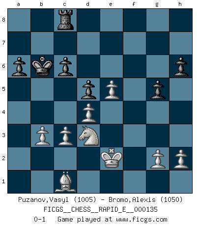 Last move : 0-1 2014 December 1 0:23:32 [Event "FICGS__CHESS__RAPID_E__000135"] [Site "FICGS"] [Date "2014.08.31"] [Round "1"] [White "Puzanov,Vasyl"] [Black "Bromo,Alexis"] [Result "0-1"] [WhiteElo "1005"] [BlackElo "1050"] 1.e4 e5 2.f4 exf4 3.Nf3 Nc6 4.d4 d5 5.e5 Be6 6.Bxf4 h6 7.Be2 a6 8.O-O Bb4 9.c3 Ba5 10.Nbd2 Nge7 11.Bd3 Bf5 12.Qc2 g6 13.Bxf5 Nxf5 14.Nb3 Bb6 15.a4 Nce7 16.Ne1 g5 17.Bd2 c6 18.Rxf5 Nxf5 19.Qxf5 Qe7 20.Nd3 Bc7 21.a5 Qe6 22.Qxe6+ fxe6 23.Nbc5 O-O-O 24.Nxe6 Rde8 25.Nxc7 Kxc7 26.b3 Rhf8 27.Rf1 Rxf1+ 28.Kxf1 b6 29.axb6+ Kxb6 30.Ke2 Rf8 31.Bc1 Rc8 0-1 This chess game has been lost on time (started : 2014.08.31 13:7:50) King's knight's gambit Kingside Castling by player White (move 8) Queenside Castling by player Black (move 23) Player Black won this chess game. Follow this game move after move (download)The passed pawn is a criminal, who should be kept under lock and key. Mild measures, such as police surveillance, are not sufficient. (Nimzovitch) Wenn ich mich einlogge, glauben die Leute gewöhnlich nicht, dass ich es selbst bin und sie fangen an, mir dumme Fragen zu stellen. Und wenn sie es glauben, stellen sie wieder andere dumme Fragen. (Judith Polgar) Si no le temes a Spassky, entonces elimino el elemento del dinero. (Jim Slater) Fischer est le meilleur joueur du monde et Karpov n'est qu'un joueur de bistrot. (Garry Kasparov, agé de 16 ans) The Internet is the world's largest library. It's just that all the books are on the floor. (John Allen Paulos)