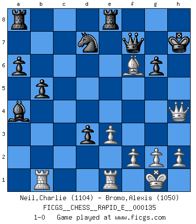Last move : 1-0 2014 September 27 10:24:2 [Event "FICGS__CHESS__RAPID_E__000135"] [Site "FICGS"] [Date "2014.08.31"] [Round "1"] [White "Neil,Charlie"] [Black "Bromo,Alexis"] [Result "1-0"] [WhiteElo "1104"] [BlackElo "1050"] 1.d4 d5 2.c4 e6 3.Nf3 h6 4.Nc3 Nf6 5.e3 Bb4 6.Bd3 Bxc3+ 7.bxc3 O-O 8.cxd5 Nxd5 9.c4 Nf6 10.O-O a6 11.Bb2 Bd7 12.Qe2 Ba4 13.Rab1 b6 14.Rfe1 c5 15.d5 exd5 16.cxd5 Qxd5 17.Ne5 Nbd7 18.Nf3 Qxa2 19.Nh4 Rfe8 20.Nf5 b5 21.Qf3 c4 22.Qg3 g6 23.Nxh6+ Kh7 24.Nxf7 cxd3 25.Bxf6 Qxf7 26.Qh4+ 1-0 Queen's gambit declined Kingside Castling by player Black (move 7) Kingside Castling by player White (move 10) Player White won this chess game. Follow this game move after move (download)A passed Pawn increases in strength as the number of pieces on the board diminishes. (Capablanca) Herr Iljumschinow ist ein etwas merkwürdiger Geschäftsmann: Er arbeitet zusammen mit Leuten wie Muammar al-Gaddafi; früher ist das Saddam Hussein gewesen. (Joel Lautier) Entre mas años cumplo, mas valoro los Peones. (Keres) Roi des jeux et jeu des rois, les échecs portent en eux un sentiment d'infini. Ils donnent à celui qui s'est efforcé d'en approfondir les arcanes l'impression de n'être pas à la mesure de l'homme; en fait, ils constituent un résumé de l'univers, un microcosme, et figurent cette grande échelle qui, dans les plans de la lumière descend jusqu'à la matière, qui des abîmes insondables remonte jusqu'en l'infini de Dieu. (Pyrame) If you are going through hell, keep going. (Winston Churchill)