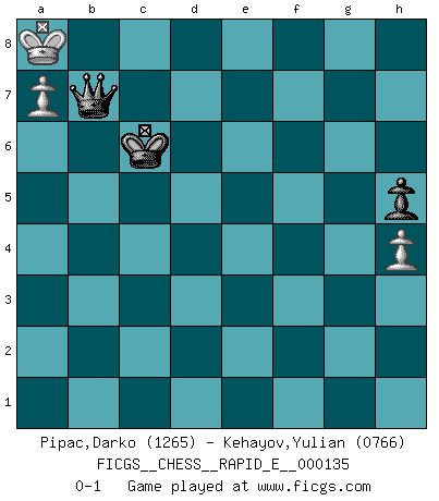 Last move : 0-1 2014 November 4 21:57:37 [Event "FICGS__CHESS__RAPID_E__000135"] [Site "FICGS"] [Date "2014.08.31"] [Round "1"] [White "Pipac,Darko"] [Black "Kehayov,Yulian"] [Result "0-1"] [WhiteElo "1265"] [BlackElo "0766"] 1.e4 e5 2.c3 d5 3.exd5 Qxd5 4.d4 Nc6 5.Qe2 Bd6 6.Nf3 h6 7.Qe3 Nf6 8.Nbd2 O-O 9.Bc4 Qa5 10.a3 exd4 11.Qd3 Qf5 12.Qxf5 Bxf5 13.O-O dxc3 14.bxc3 Ne4 15.Nxe4 Bxe4 16.Re1 Rfe8 17.Nd4 Nxd4 18.cxd4 Bf5 19.Bb2 Rxe1+ 20.Rxe1 Bd7 21.Bd5 c6 22.Bf3 Re8 23.Rxe8+ Bxe8 24.d5 cxd5 25.Bxd5 Bc6 26.Bxc6 bxc6 27.h3 g6 28.f3 h5 29.Kf2 Kf8 30.Ke3 Ke7 31.Ke4 Ke6 32.a4 a6 33.Bd4 f5+ 34.Ke3 c5 35.Bc3 Be5 36.Kd3 Bxc3 37.Kxc3 Kd5 38.a5 g5 39.g3 c4 40.h4 gxh4 41.gxh4 f4 42.Kb2 Kd4 43.Kc2 Ke3 44.Kc3 Kxf3 45.Kxc4 Ke3 46.Kc5 f3 47.Kb6 f2 48.Kxa6 f1Q+ 49.Kb6 Qb1+ 50.Ka7 Kd4 51.a6 Kc5 52.Ka8 Kc6 53.a7 Qb7+ 0-1 Variation Lopez Opening : Lopez Opening Kingside Castling by player Black (move 8) Kingside Castling by player White (move 13) 10 pieces endgame at move 40 : White KPPP , Black KPPPPP WHITE : King + 3 Pawns BLACK : King + 5 Pawns 9 pieces endgame at move 41 : White KPPP , Black KPPPP WHITE : King + 3 Pawns BLACK : King + 4 Pawns 8 pieces endgame at move 44 : White KPP , Black KPPPP WHITE : King + 2 Pawns BLACK : King + 4 Pawns 7 pieces endgame at move 45 : White KPP , Black KPPP WHITE : King + 2 Pawns BLACK : King + 3 Pawns 6 pieces endgame at move 48 : White KPP , Black KPP WHITE : King + 2 Pawns BLACK : King + 2 Pawns Promotion Queen by player Black (move 48) Player Black won this chess game. Follow this game move after move (download)Chess is mental torture. (Garry Kasparov) Mein Name ist Rustam Kamsky. Sie haben meinen Sohn belästigt. Bereiten Sie sich aufs Sterben vor. (Rustam Kamsky) La batalla por la última verdad nunca sera ganada. Y es por eso que el Ajedrez es tan fascinante. (Hans Kmoch) Des points faibles ou des trous dans la position de l'adversaire doivent être occupés par des pièces et non pas par des pions. (Siegbert Tarrasch) There are lots of people who mistake their imagination for their memory. (Josh Bilings)