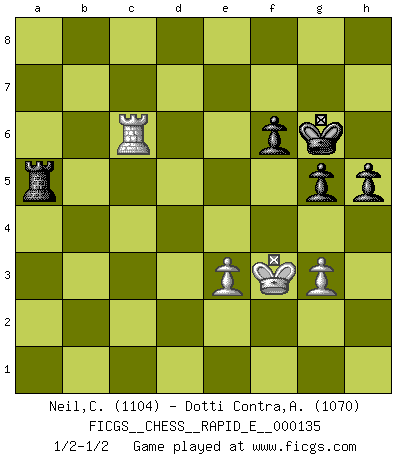 Last move : 1/2-1/2 2014 November 28 16:22:45 [Event "FICGS__CHESS__RAPID_E__000135"] [Site "FICGS"] [Date "2014.08.31"] [Round "1"] [White "Neil,Charlie"] [Black "Dotti Contra,Alessandro"] [Result "1/2-1/2"] [WhiteElo "1104"] [BlackElo "1070"] 1.d4 d5 2.Nf3 Nf6 3.Bg5 Bf5 4.c4 e6 5.e3 Be7 6.Nc3 O-O 7.Qb3 b6 8.cxd5 exd5 9.Bxf6 Bxf6 10.Nxd5 Be6 11.Nxf6+ Qxf6 12.Qc3 c6 13.Bd3 g6 14.O-O a6 15.Ne5 Rc8 16.Bc4 Nd7 17.Bxe6 Qxe6 18.a3 c5 19.Nxd7 Qxd7 20.dxc5 Rxc5 21.Qb4 Qc6 22.Qf4 Rd8 23.b4 Rf5 24.Qh4 Qc7 25.Rac1 Qb8 26.Rc6 Rh5 27.Qg3 Qxg3 28.hxg3 Rb8 29.Rd1 a5 30.Rdc1 axb4 31.axb4 Rb5 32.Rc8+ Rxc8 33.Rxc8+ Kg7 34.Rc6 Rxb4 35.Kf1 Rb1+ 36.Ke2 Rb2+ 37.Kf3 b5 38.Rb6 h5 39.Rb7 b4 40.Ke4 Rxf2 41.Rxb4 Rxg2 42.Kf3 Rg1 43.Kf2 Rc1 44.Ra4 g5 45.Ra6 Rc5 46.Kg2 Re5 47.Kf3 f6 48.Rb6 Kg6 49.Rc6 Rf5+ 50.Kg2 Ra5 51.Kf3 1/2-1/2 Torre attack (Tartakower variation) Kingside Castling by player Black (move 6) Kingside Castling by player White (move 14) 10 pieces endgame at move 41 : White KRPPP , Black KRPPP WHITE : King + 1 Rook 3 Pawns BLACK : King + 1 Rook 3 Pawns 9 pieces endgame at move 41 : White KRPP , Black KRPPP WHITE : King + 1 Rook 2 Pawns BLACK : King + 1 Rook 3 Pawns This chess game ended in a draw. Follow this game move after move (download)A thorough understanding of the typical mating continuations makes the most complicated sacrificial combinations leading up to them not only not difficult, but almost a matter of course. (Siegbert Tarrasch) Ich würde mich als ganz normalen Jungen bezeichnen [Im Alter von 12]. (Sergej Karjakin) Cuando tengas duda... ¡juega al Ajedrez!. (Tevis) Les Echecs ont trois composantes : le temps, l'espace et le matériel en dernier. (Mikhail Tal) Luck never made a man wise. (Seneca, Letters to Lucilius)