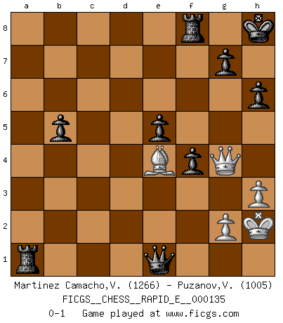 Last move : 0-1 2014 November 24 23:10:29 [Event "FICGS__CHESS__RAPID_E__000135"] [Site "FICGS"] [Date "2014.08.31"] [Round "1"] [White "Martinez Camacho,Victor Hugo"] [Black "Puzanov,Vasyl"] [Result "0-1"] [WhiteElo "1266"] [BlackElo "1005"] 1.e4 e5 2.Nf3 Nc6 3.Bb5 a6 4.Ba4 b5 5.Bb3 h6 6.O-O Bb7 7.d3 Nf6 8.Nc3 Bc5 9.a3 O-O 10.Be3 Bxe3 11.fxe3 d6 12.h3 Kh8 13.Nd5 Nxd5 14.Bxd5 Kg8 15.d4 Qb8 16.dxe5 Nxe5 17.Nxe5 dxe5 18.Qg4 c6 19.Ba2 c5 20.Qd7 c4 21.b3 Bxe4 22.bxc4 Qb6 23.cxb5 Ra7 24.Qg4 Qxe3+ 25.Kh1 Bxc2 26.Rae1 Qxa3 27.Bc4 axb5 28.Rf3 Qa5 29.Bd5 Qxe1+ 30.Kh2 Bd1 31.Be4 Bxf3 32.Bxf3 f5 33.Qg6 f4 34.Qe6+ Kh7 35.Qg4 Ra1 36.Be4+ Kh8 0-1 Ruy Lopez : Caro variation Kingside Castling by player White (move 6) Kingside Castling by player Black (move 9) Player Black won this chess game. Follow this game move after move (download)Chess is not like life... it has rules ! (Mark Pasternak) Man wirke der falschen Auffassung entgegen, als ob jeder Zug Unmittelbares zu leisten habe; auch Werte- und Ruhezüge haben ihre Existenzberechtigung. (Aaron Nimzowitsch) No puedes jugar al Ajedrez si eres de corazón noble. (Proverbio Francés) Psychologiquement, tu dois avoir confiance en toi même, mais cette confiance doit être basée sur des faits. (Robert Fischer) Kids, you tried your best and you failed miserably. The lesson is, never try. (Simpsons)