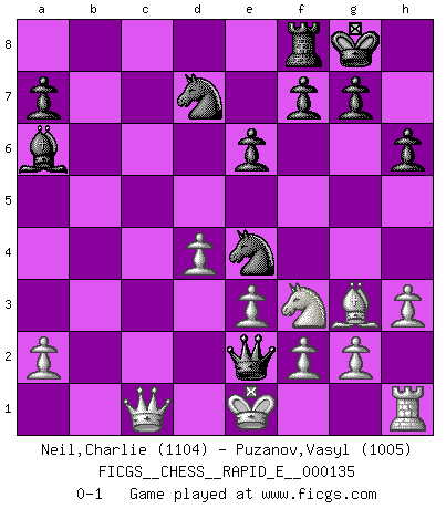 Last move : 0-1 2014 November 9 21:57:6 [Event "FICGS__CHESS__RAPID_E__000135"] [Site "FICGS"] [Date "2014.08.31"] [Round "1"] [White "Neil,Charlie"] [Black "Puzanov,Vasyl"] [Result "0-1"] [WhiteElo "1104"] [BlackElo "1005"] 1.d4 d5 2.Nf3 Nf6 3.Bg5 e6 4.c4 Bb4+ 5.Nc3 O-O 6.e3 c5 7.Bd3 h6 8.Bh4 Bxc3+ 9.bxc3 cxd4 10.cxd4 dxc4 11.Bxc4 Nbd7 12.h3 b5 13.Bxb5 Qa5+ 14.Qd2 Qxb5 15.Bg3 Ne4 16.Qc2 Ba6 17.Rc1 Rac8 18.Qd1 Rxc1 19.Qxc1 Qe2+ 0-1 Torre attack (Tartakower variation) Kingside Castling by player Black (move 5) Player Black won this chess game. Follow this game move after move (download)Good positions don't win games, good moves do. (Gerald Abrahams) Wenn ich einen Club besuche, sind die Spieler stumm vor Staunen. (José Raúl Capablanca) El Ajedrez es una hermosa aventura. (Bent Larsen) À la honte des hommes, on sait que les lois du jeu sont les seules qui soient partout justes, claires, inviolables et exécutées. Pourquoi l'Indien qui a donné les règles du jeu d'échecs est-il obéi de bon gré dans toute la terre, et que les décrétales des papes, par exemple, sont aujourd'hui un objet d'horreur et de mépris ? C'est que l'inventeur des échecs combina tout avec justesse pour la satisfaction des joueurs, et que les papes, dans leurs décrétales, n'eurent en vue que leur seul avantage. L'Indien voulut exercer également l'esprit des hommes et leur donner du plaisir; les papes ont voulu abrutir l'esprit des hommes. Voltaire (Dictionnaire philosophique / Garnier 1967) Success without honor is an unseasoned dish; it will satisfy your hunger, but it won't taste good. (Joe Paterno)
