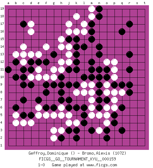 Last move : 1-0 2015 January 11 13:10:3 [Event "FICGS__GO__TOURNAMENT_KYU__000159"] [Site "FICGS"] [Date "2014.09.01"] [Round "1"] [Black "Geffroy,Dominique"] [White "Bromo,Alexis"] [Result "1-0"] [Rating 2 "1072"] 1.q16 d4 2.q3 d16 3.r9 k10 4.k17 j16 5.k3 j4 6.c10 d10 7.d9 c11 8.d11 e10 9.c9 e11 10.c5 c4 11.d5 b5 12.b6 b4 13.c7 e5 14.e7 f7 15.f8 g8 16.f9 f10 17.g9 g10 18.h8 g7 19.h10 h11 20.j7 h6 21.j6 j5 22.f6 e6 23.g6 g5 24.h7 h5 25.h2 h3 26.j3 g3 27.d12 c12 28.c13 d13 29.e12 e13 30.f12 g11 31.b12 b11 32.b10 b13 33.a11 c14 34.c17 d17 35.j11 j10 36.h9 j12 37.k11 l11 38.k12 h12 39.k14 j14 40.k13 j13 41.j15 h15 42.k15 j17 43.g13 h14 44.l10 l9 45.m10 m9 46.k9 n10 47.m11 l12 48.m12 l13 49.l14 m13 50.n13 m14 51.m15 k16 52.n14 l16 53.m16 l17 54.m17 k18 55.l5 k4 56.l4 g2 57.k2 m18 58.n18 m19 59.n19 f14 60.n9 o9 61.n8 k8 62.j9 l8 63.n6 o8 64.o7 p7 65.o10 p10 66.o11 o6 67.n7 p8 68.q9 p11 69.p9 o12 70.n11 p12 71.q6 p6 72.p5 o5 73.p4 o4 74.o3 n5 75.m3 q8 76.r8 n3 77.o2 m5 78.l6 m6 79.k6 f5 80.r13 m7 81.r11 m8 82.n10 c12 83.c11 c13 84.r17 1-0 Here are the names of the openings (joseki) played in the four corners : Corner q16 : q16 l11 Hoshi (Hwajeom, Seongjeom, Xingwei`) 4-4 Point. The star or hoshi (4-4) point, emphasizing influence at the potential expense of territory. Player Black won this Go (weiqi, baduk) game. Follow this game move after move (download)To emphasize the lack of determination in his moves, one speaks of chance. (Pierre Audouard) Good luck. You're gonna need it. (Han Solo in Star Wars ep.6)
