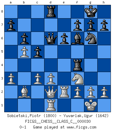 Last move : 0-1 2007 July 25 12:36:57 [Event "FICGS__CHESS__CLASS_C__000030"] [Site "FICGS"] [Date "2007.02.21"] [Round "1"] [White "Sobietski,Piotr"] [Black "Yuvarlak,Ugur"] [Result "0-1"] [WhiteElo "1800"] [BlackElo "1642"] 1.e4 c5 2.c3 Nf6 3.e5 Nd5 4.Nf3 Nc6 5.Bc4 Nb6 6.Bb3 d5 7.exd6 Qxd6 8.O-O Be6 9.Na3 Bxb3 10.Qxb3 Qd3 11.Re1 e6 12.Re3 Qd7 13.Nc4 Nxc4 14.Qxc4 Rd8 15.b3 Be7 16.Bb2 O-O 17.d3 Qc7 18.Rae1 Rd5 19.Qe4 Rfd8 20.a3 Rf5 21.R3e2 Qd6 22.Rd1 Rf4 23.Qe3 Bf6 24.b4 b6 25.Qd2 Ne7 26.b5 Ng6 0-1 Sicilian : Alapin's variation (2.c3) Kingside Castling by player White (move 8) Kingside Castling by player Black (move 16) Player Black won this chess game. Follow this game move after move (download)As one by one I mowed them down, my superiority soon became apparent. (Jose Capablanca) Wir irren allesamt, nur jeder irrt anders. (Georg Christoph Lichtenberg) Prefiero perder una partida realmente buena, que ganar una mala. (David Levy) Votre prénom est 'Tactique', votre deuxième prénom est 'Tactique' et votre nom est 'Tactique'. (Ken Smith) Information on the Internet is subject to the same rules and regulations as conversation at a bar. (George Lundberg)