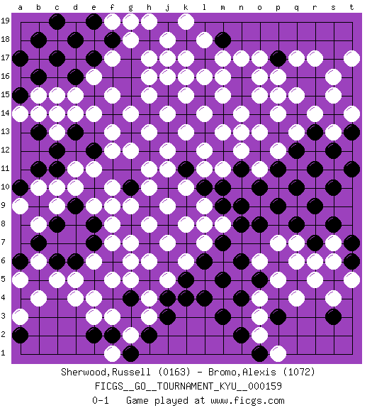Last move : 0-1 2015 May 17 8:57:29 [Event "FICGS__GO__TOURNAMENT_KYU__000159"] [Site "FICGS"] [Date "2014.09.01"] [Round "1"] [Black "Sherwood,Russell"] [White "Bromo,Alexis"] [Result "0-1"] [Rating 1 "0163"] [Rating 2 "1072"] 1.d16 q4 2.q16 d4 3.k4 d10 4.q10 k16 5.j17 j16 6.j15 h16 7.g16 h17 8.h18 k17 9.k18 j18 10.j19 j17 11.l17 l16 12.l15 m16 13.n16 m17 14.m18 l18 15.f18 k19 16.g17 h19 17.g19 g18 18.e17 f19 19.e19 g19 20.d18 n17 21.f16 e14 22.e15 d14 23.f14 f13 24.c17 c15 25.b16 b15 26.g13 g12 27.h12 f12 28.g15 h11 29.h14 j12 30.j13 h13 31.k14 g14 32.c19 f15 33.b18 k13 34.a17 d15 35.a15 a14 36.l13 j14 37.k11 h15 38.m14 k15 39.n15 e16 40.b13 f17 41.m12 l14 42.n13 m15 43.o14 l12 44.o12 m13 45.n11 m11 46.m10 n12 47.o10 n14 48.j10 j11 49.g10 f10 50.k9 h10 51.h9 g9 52.g8 f9 53.j8 f8 54.e8 f7 55.h7 g7 56.j6 h6 57.k7 j5 58.h5 g6 59.f6 g5 60.g4 h4 61.l8 h8 62.k5 j7 63.m7 j9 64.j3 h3 65.n9 k6 66.l6 k8 67.m5 k10 68.n8 l9 69.p13 o13 70.p11 l7 71.n6 m8 72.m9 l8 73.p9 n13 74.q12 o15 75.o8 o16 76.p15 p16 77.p17 o17 78.q14 p14 79.l10 l11 80.j4 q15 81.r15 p15 82.e10 e11 83.d9 e9 84.e7 e6 85.e5 f5 86.r13 q17 87.r16 r17 88.s14 s16 89.t15 s15 90.t16 r14 91.t13 t17 92.s12 t14 93.r11 q13 94.q8 p12 95.h2 g2 96.g1 f1 97.e2 e3 98.c14 c13 99.d13 b14 100.c12 c14 101.e12 d11 102.c11 c10 103.b11 b10 104.a10 a9 105.b9 c9 106.c8 b8 107.b7 d5 108.f2 f3 109.n4 p5 110.o5 q6 111.r7 r6 112.r9 s7 113.s10 o11 114.s8 q7 115.p6 p7 116.m3 s13 117.t11 o6 118.l4 o4 119.p3 o3 120.n2 o2 121.o1 p1 122.t7 s6 123.t6 t5 124.s5 s4 125.s3 r5 126.d6 e4 127.c6 c5 128.b5 b4 129.a4 a3 130.a2 a5 131.a6 b6 0-1 Here are the names of the openings (joseki) played in the four corners : Corner d4 : d4 h9 Hoshi (Hwajeom, Seongjeom, Xingwei`) 4-4 Point. The star or hoshi (4-4) point, emphasizing influence at the potential expense of territory. Corner q4 : q4 l8 Hoshi (Hwajeom, Seongjeom, Xingwei`) 4-4 Point. The star or hoshi (4-4) point, emphasizing influence at the potential expense of territory. Player White won this Go (weiqi, baduk) game. Follow this game move after move (download)Keshi is worth as much as an invasion ! (Anonymous) We're missing something. (Gregory House, House M.D.)
