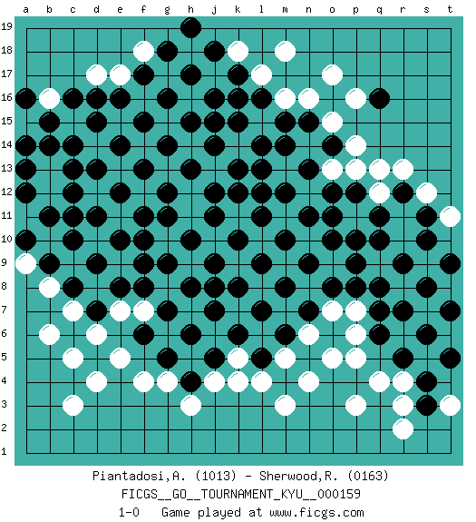 Last move : 1-0 2015 April 25 10:47:19 [Event "FICGS__GO__TOURNAMENT_KYU__000159"] [Site "FICGS"] [Date "2014.09.01"] [Round "1"] [Black "Piantadosi,Angelo"] [White "Sherwood,Russell"] [Result "1-0"] [Rating 1 "1013"] [Rating 2 "0163"] 1.q16 q4 2.d16 d4 3.k16 k4 4.q10 d10 5.c12 r8 6.p8 n8 7.q7 p6 8.q6 q9 9.p9 o9 10.o10 p11 11.p10 p7 12.q8 p5 13.r9 s9 14.s8 s7 15.r7 r6 16.s6 s5 17.r5 r4 18.s4 n10 19.l12 m9 20.k10 o7 21.o11 m11 22.m12 l10 23.p12 l8 24.j8 k7 25.j7 m7 26.k6 l6 27.k8 k9 28.j9 j6 29.l7 n6 30.l9 m5 31.m8 n12 32.n13 k11 33.l11 o13 34.m10 m13 35.n11 j10 36.j11 h11 37.k12 j13 38.o12 n14 39.n9 h9 40.h10 g10 41.l13 k14 42.m14 l15 43.k15 j15 44.j16 h14 45.h15 g15 46.j14 h16 47.j15 j17 48.l16 m16 49.l14 h12 50.m15 o15 51.k13 g13 52.g9 g8 53.h8 f14 54.f9 e9 55.f8 d12 56.c11 c9 57.d11 f16 58.f10 e11 59.g11 f12 60.j12 o5 61.g7 e13 62.c13 d14 63.c14 c15 64.d15 e15 65.c16 d17 66.b15 g17 67.d13 e17 68.e12 d8 69.e14 e7 70.f13 g6 71.h6 h5 72.j5 k5 73.g5 g4 74.h4 h3 75.f6 e5 76.h13 b10 77.g12 p14 78.g14 l17 79.k17 k18 80.f15 d6 81.g16 n16 82.o8 q12 83.q11 q13 84.n7 n4 85.m6 p16 86.h17 f18 87.t7 a11 88.e16 c7 89.l5 l4 90.f11 m3 91.f17 r11 92.g18 o17 93.j18 m18 94.e10 b8 95.s10 s12 96.t9 r13 97.n15 p13 98.o14 c5 99.c10 a15 100.a14 a9 101.a16 b6 102.d9 j4 103.e8 f4 104.t5 t3 105.s3 r10 106.s11 t11 107.r12 b12 108.b11 b13 109.b14 r3 110.a13 r2 111.a12 c3 112.a10 b16 113.b9 f7 114.c8 h18 115.h19 p3 116.d7 1-0 Here are the names of the openings (joseki) played in the four corners : Corner q16 : q16 p11 Hoshi (Hwajeom, Seongjeom, Xingwei`) 4-4 Point. The star or hoshi (4-4) point, emphasizing influence at the potential expense of territory. Corner d4 : d4 j8 Hoshi (Hwajeom, Seongjeom, Xingwei`) 4-4 Point. The star or hoshi (4-4) point, emphasizing influence at the potential expense of territory. Player Black won this Go (weiqi, baduk) game. Follow this game move after move (download)Keep away from thickness. (Anonymous) Waiting for chance ? Play in casinos. (FICGS proverb)