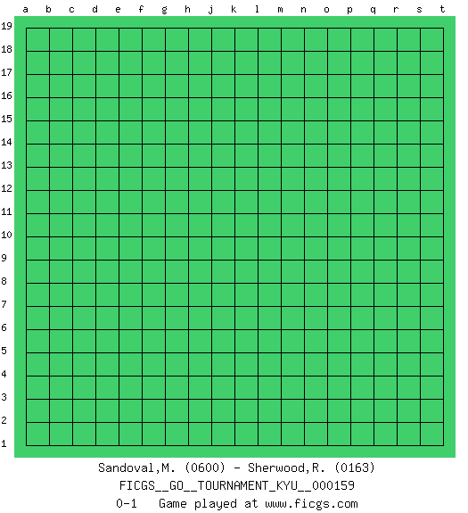 Last move : 0-1 2014 October 2 8:53:18 [Event "FICGS__GO__TOURNAMENT_KYU__000159"] [Site "FICGS"] [Date "2014.09.01"] [Round "1"] [Black "Sandoval,Martin"] [White "Sherwood,Russell"] [Result "0-1"] [Rating 1 "0600"] [Rating 2 "0163"] 0-1 This go game has been lost on time (started : 2014.09.01 21:29:9) Here are the names of the openings (joseki) played in the four corners : Player White won this Go (weiqi, baduk) game. Follow this game move after move (download)Conservative and slow will win. Believe it ! (Anonymous) I don't know, I don't care, and it doesn't make any difference. (Albert Einstein)