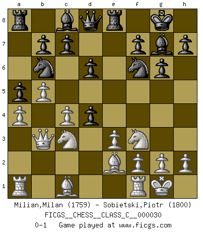 Last move : 0-1 2007 May 23 10:42:41 [Event "FICGS__CHESS__CLASS_C__000030"] [Site "FICGS"] [Date "2007.02.21"] [Round "1"] [White "Milian,Milan"] [Black "Sobietski,Piotr"] [Result "0-1"] [WhiteElo "1759"] [BlackElo "1800"] 1.c4 Nf6 2.d4 g6 3.Nf3 Bg7 4.e3 O-O 5.Nc3 d6 6.Be2 Nbd7 7.O-O e5 8.b4 Re8 9.a4 a5 10.b5 Nb6 11.Qb3 exd4 0-1 This chess game has been lost on time (started : 2007.02.21 1:17:21) English, 1...Nf6 (Anglo-Indian defense) Kingside Castling by player Black (move 4) Kingside Castling by player White (move 7) Player Black won this chess game. Follow this game move after move (download)When you absolutely don't know what to do anymore, it is time to panic. (John van der Wiel) Auf Remis zu spielen ist gewissermaßen ein Verbrechen gegen das Schachspiel. (Mikhail Nekhemyevich Tal) El jugador táctico sabe que hacer cuando hay algo que hacer; mientras que el estratega sabe que hacer cuando no hay nada que hacer. (Gerald Abrahams) Il n'y a plus de joueurs du niveau de Jacob Murray dont la seule quête est le beau jeu, le plaisir de voir les pièces construire quelque chose. Sur 10 idées à la minute, 9 seront sans intérêt, la dernière s'avèrera géniale. (Christian Bauer) A generalist learns less and less about more and more until he knows nothing about everything. (Author unknown)