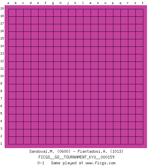 Last move : 0-1 2014 October 2 8:53:18 [Event "FICGS__GO__TOURNAMENT_KYU__000159"] [Site "FICGS"] [Date "2014.09.01"] [Round "1"] [Black "Sandoval,Martin"] [White "Piantadosi,Angelo"] [Result "0-1"] [Rating 1 "0600"] [Rating 2 "1013"] 0-1 This go game has been lost on time (started : 2014.09.01 21:29:9) Here are the names of the openings (joseki) played in the four corners : Player White won this Go (weiqi, baduk) game. Follow this game move after move (download)Nothing requires doing this or that, but necessity exists. (Pierre Audouard) Chess is everything: art, science and sport. (Anatoly Karpov)