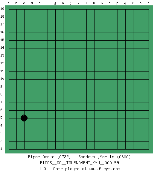 Last move : 1-0 2014 October 2 8:53:18 [Event "FICGS__GO__TOURNAMENT_KYU__000159"] [Site "FICGS"] [Date "2014.09.01"] [Round "1"] [Black "Pipac,Darko"] [White "Sandoval,Martin"] [Result "1-0"] [Rating 1 "0732"] [Rating 2 "0600"] 1.c5 1-0 This go game has been lost on time (started : 2014.09.01 21:29:9) Here are the names of the openings (joseki) played in the four corners : Corner d4 : c5 1-0 Mokuhazushi (Waemok, Wai`mu`) 5-3 Point. The mokuhazushi (5-3) point was popular in the Edo period in Japan (1600 - 1867). It emphasizes influence; territorially, it is inferior to the 3-4 point. Player Black won this Go (weiqi, baduk) game. Follow this game move after move (download)The game plays itself, the players don't control it. (Pierre Audouard) Wisdom doesn't necessarily come with age. Sometimes age just shows up all by itself. (Tom Wilson)