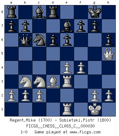 Last move : 1-0 2007 August 5 14:9:19 [Event "FICGS__CHESS__CLASS_C__000030"] [Site "FICGS"] [Date "2007.02.21"] [Round "1"] [White "Regent,Mike"] [Black "Sobietski,Piotr"] [Result "1-0"] [WhiteElo "1700"] [BlackElo "1800"] 1.e4 c5 2.Nf3 d6 3.d4 cxd4 4.Nxd4 Nf6 5.Nc3 Nc6 6.Bc4 Qb6 7.Nb3 e6 8.O-O Be7 9.Be3 Qc7 10.f4 O-O 11.Bd3 Rd8 12.Rf3 Ng4 13.Rh3 Nxe3 14.Qh5 h6 15.Rxe3 Qb6 16.Rae1 1-0 This chess game has been lost on time (started : 2007.02.21 1:17:21) Sicilian : Sozin, Benko variation Kingside Castling by player White (move 8) Kingside Castling by player Black (move 10) Player White won this chess game. Follow this game move after move (download)I'd rather have a Pawn than a finger. (Reuben Fine) Ich verlor meine Bürgerrechte, mein Gehalt wurde mir nicht mehr bezahlt und ich wurde zensiert und durfte nicht mehr ins Ausland reisen. [nach dem Match Fischer-Taimanov 6:0] (Mark Taimanov) Yo considero que Fischer es uno de los expertos mas grandes de aperturas de siempre. (Keith Hayward) La vie est comme un jeu d'échecs : nous esquissons un plan, mais celui-ci est tributaire de ce que daignent faire l'adversaire aux échecs et le destin dans la vie. (Arthur Schopenhauer) Only sick music makes money today. (Friedrich Nietzsche)