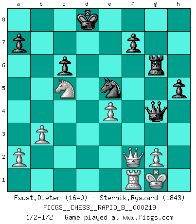 Last move : 1/2-1/2 2014 October 12 14:28:55 [Event "FICGS__CHESS__RAPID_B__000219"] [Site "FICGS"] [Date "2014.09.05"] [Round "1"] [White "Faust,Dieter"] [Black "Sternik,Ryszard"] [Result "1/2-1/2"] [WhiteElo "1640"] [BlackElo "1843"] 1.d4 d5 2.c4 c6 3.Nf3 Nf6 4.Nc3 e6 5.Bg5 h6 6.Bh4 dxc4 7.e4 g5 8.Bg3 b5 9.Be2 Bb7 10.h4 g4 11.Ne5 Rg8 12.Nxg4 Nxg4 13.Bxg4 b4 14.Na4 Nd7 15.O-O Be7 16.Rc1 Ba6 17.Be2 Bxh4 18.Bxc4 Bxc4 19.Rxc4 Bxg3 20.fxg3 Rxg3 21.Qh5 Rg6 22.Rxb4 Qg5 23.Qe2 Qg4 24.Qc2 e5 25.b3 exd4 26.Rxd4 Ne5 27.Qf2 Rd8 28.Rxd8+ Kxd8 29.Nc5 h5 1/2-1/2 QGD Slav : 4.Nc3 Kingside Castling by player White (move 15) This chess game ended in a draw. Follow this game move after move (download)Chess is thirty to forty percent psychology. You don't have this when you play a computer. I can't confuse it. (Judith Polgar) Das Schachspiel ist ein See, in welchem eine Mücke baden und ein Elefant ertrinken kann. (Emanuel Lasker) No hay otro maestro que tenga una voluntad terrífica de ganar. Al tablero, el irradía peligro y aún los oponentes mas fuertes tienden a congelarse como liebres cuando olfatean a una pantera. Aún sus debilidades son peligrosas. Con las blancas, su juego de apertura es predecible - te es posible hacer planes en su contra - pero es tan fuerte que tus planes casi nunca funcionan. En el juego medio, su precisión e invención son fabulosas y en finales, tú simplemente no le puedes vencer. (Experto Alemán anónimo) Pour moi, les échecs ne sont pas un jeu mais un art. (Alexandre Alekhine) Wisdom doesn't necessarily come with age. Sometimes age just shows up all by itself. (Tom Wilson)