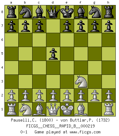 Last move : 0-1 2014 October 8 9:30:43 [Event "FICGS__CHESS__RAPID_B__000219"] [Site "FICGS"] [Date "2014.09.05"] [Round "1"] [White "Pauselli,Claudio"] [Black "von Buttlar,Paul"] [Result "0-1"] [WhiteElo "1800"] [BlackElo "1732"] 1.Nf3 d5 0-1 This chess game has been lost on time (started : 2014.09.05 22:50:18) Reti Opening Player Black won this chess game. Follow this game move after move (download)There's never before been a Chess player with such a thorough knowledge of the intricacies of the game and such an absolutely indomitable will to win. I think Bobby is the greatest player that ever lived. (Lisa Lane) Schach ist ein Kampf gegen den Fehler. (Johannes Herrman Zukertort) La única cosa que los jugadores de Ajedrez tienen en común, es el Ajedrez. (Lodewijk Prins) Il n'y a plus de joueurs du niveau de Jacob Murray dont la seule quête est le beau jeu, le plaisir de voir les pièces construire quelque chose. Sur 10 idées à la minute, 9 seront sans intérêt, la dernière s'avèrera géniale. (Christian Bauer) He who defends everything defends nothing. (Frederick the Great)