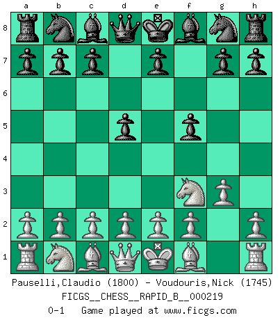 Last move : 0-1 2014 October 8 9:30:43 [Event "FICGS__CHESS__RAPID_B__000219"] [Site "FICGS"] [Date "2014.09.05"] [Round "1"] [White "Pauselli,Claudio"] [Black "Voudouris,Nick"] [Result "0-1"] [WhiteElo "1800"] [BlackElo "1745"] 1.Nf3 d5 2.g3 f5 0-1 This chess game has been lost on time (started : 2014.09.05 22:50:18) Reti : King's Indian attack (Barcza system) Player Black won this chess game. Follow this game move after move (download)Who is your opponent tonight, tonight I am playing against the Black pieces. (Akiba Rubinstein) Ich habe Putins Aufstieg an die Macht beobachtet und seine Politik, die demokratischen Institutionen meines Landes zu zerstören. (Garry Kasparov) El Ajedrez es un mar en el cual un mosquito puede beber y un elefante puede bañarse. (Refrán Hindú) On croit qu'il y a plus de mauvais joueurs que de bons joueurs, c'est faux : Il y a autant de joueurs qui gagnent que de joueurs qui perdent. (Philippe Geluck) There is no instance of a country having benefited from prolonged warfare. (Sun Tzu)
