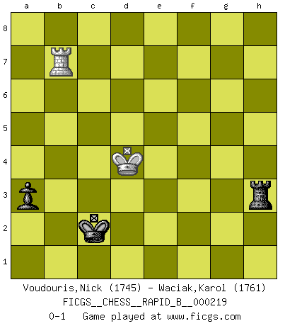 Last move : 0-1 2014 December 28 20:41:1 [Event "FICGS__CHESS__RAPID_B__000219"] [Site "FICGS"] [Date "2014.09.05"] [Round "1"] [White "Voudouris,Nick"] [Black "Waciak,Karol"] [Result "0-1"] [WhiteElo "1745"] [BlackElo "1761"] 1.d4 f5 2.h3 Nf6 3.g4 d5 4.Qd3 c5 5.gxf5 Nc6 6.c3 Ne4 7.Nd2 Bxf5 8.Bg2 e6 9.Nxe4 cxd4 10.cxd4 Be7 11.e3 O-O 12.Ne2 Nb4 13.Qb3 Qc8 14.O-O Bxe4 15.Bxe4 dxe4 16.Bd2 Nd5 17.Nf4 Rf6 18.f3 exf3 19.Rxf3 Bd6 20.Rg3 Bxf4 21.exf4 Qd7 22.Re1 Raf8 23.Re4 g6 24.Rg2 Nxf4 25.Bxf4 Rxf4 26.Qxe6+ Qxe6 27.Rxe6 Rxd4 28.Rge2 Rfd8 29.Re7 R8d7 30.Rxd7 Rxd7 31.Rc2 Kg7 32.Kf2 g5 33.Ke3 Kg6 34.b3 Kh5 35.Rc4 Rd6 36.Re4 h6 37.Ke2 Ra6 38.a4 Rf6 39.Rd4 Rf4 40.Rd7 Rb4 41.Rd3 Kh4 42.Kf2 h5 43.Kg2 g4 44.hxg4 hxg4 45.Kf2 b6 46.Rd7 a5 47.Rd3 Kg5 48.Kg3 Kf5 49.Kh4 Ke4 50.Rg3 Rd4 51.Kg5 Rd5 52.Kh4 Rd3 53.Rxg4+ Kd5 54.Rg5+ Kc6 55.Rg6+ Kc5 56.Rg5+ Kb4 57.Rb5+ Ka3 58.Rxb6 Rxb3 59.Re6 Kxa4 60.Kg4 Ka3 61.Kf4 a4 62.Ke4 Kb2 63.Kd4 Rc3 64.Rb6+ Kc2 65.Rb4 a3 66.Rb7 Rh3 0-1 Dutch, Korchnoi attack Kingside Castling by player Black (move 11) Kingside Castling by player White (move 14) 10 pieces endgame at move 44 : White KRPPP , Black KRPPP WHITE : King + 1 Rook 3 Pawns BLACK : King + 1 Rook 3 Pawns 9 pieces endgame at move 44 : White KRPP , Black KRPPP WHITE : King + 1 Rook 2 Pawns BLACK : King + 1 Rook 3 Pawns 8 pieces endgame at move 53 : White KRPP , Black KRPP WHITE : King + 1 Rook 2 Pawns BLACK : King + 1 Rook 2 Pawns 7 pieces endgame at move 58 : White KRPP , Black KRP WHITE : King + 1 Rook 2 Pawns BLACK : King + 1 Rook 1 Pawn 6 pieces endgame at move 58 : White KRP , Black KRP WHITE : King + 1 Rook 1 Pawn BLACK : King + 1 Rook 1 Pawn 5 pieces endgame at move 59 : White KR , Black KRP WHITE : King + 1 Rook BLACK : King + 1 Rook 1 Pawn Player Black won this chess game. Follow this game move after move (download)I like the moment when I break a man's ego. (Bobby Fischer) Ihnen, Herr Lasker, habe ich nur drei Worte zu sagen: Schach und matt. (Siegbert Tarrasch) Tu eres para mi la Reina en d8 y yo soy el Peón en d7!!. (GM Eduard Gufeld) Les échecs sont utiles à l'exercice de la faculté de penser et à celle de l'imagination. Car nous devons posséder une méthode élaborée pour atteindre des buts partout où nous devons conduire notre raison. (Leibnitz) I've lost money so fast in these clubs it's left me reeling. I've read every poker book ever written, but the only way to get better at the game is to go out and play with people who are really good. The problem is, you stand to lose a lot of money doing it. (Matt Damon)
