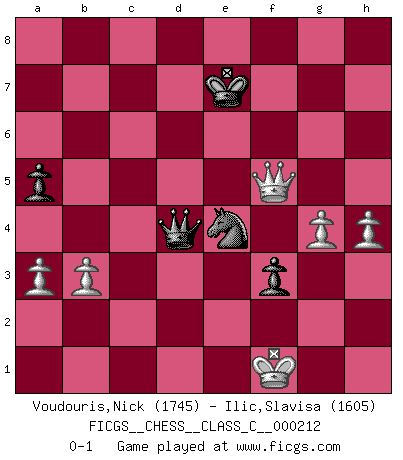 Last move : 0-1 2015 February 20 15:40:17 [Event "FICGS__CHESS__CLASS_C__000212"] [Site "FICGS"] [Date "2014.09.06"] [Round "1"] [White "Voudouris,Nick"] [Black "Ilic,Slavisa"] [Result "0-1"] [WhiteElo "1745"] [BlackElo "1605"] 1.d4 Nf6 2.f4 b6 3.e3 Bb7 4.Nf3 c5 5.c3 g6 6.Bd3 Bg7 7.Qe2 O-O 8.Nbd2 Qc7 9.O-O Nc6 10.b3 cxd4 11.Nxd4 a6 12.Bb2 e5 13.Nxc6 Bxc6 14.f5 b5 15.c4 bxc4 16.Bxc4 d5 17.fxg6 dxc4 18.gxh7+ Nxh7 19.Nxc4 Rfe8 20.Rac1 Re6 21.Rf5 Rd8 22.Nxe5 Bxe5 23.Bxe5 Rxe5 24.Rxe5 Qxe5 25.Rxc6 Qa1+ 26.Kf2 Ng5 27.Rc4 f5 28.Rd4 Rxd4 29.exd4 Qxd4+ 30.Kf1 Qa1+ 31.Qe1 Qf6 32.Qg3 Kf7 33.Qc7+ Kg6 34.Qc2 Qa1+ 35.Ke2 Qe5+ 36.Kf1 Qf4+ 37.Kg1 Qd4+ 38.Kf1 Ne4 39.g3 Nc3 40.a3 a5 41.h3 Ne4 42.g4 f4 43.h4 f3 44.Qc6+ Kg7 45.Qc7+ Kf6 46.Qf4+ Ke6 47.Qf5+ Ke7 0-1 Canard Opening Kingside Castling by player Black (move 7) Kingside Castling by player White (move 9) Player Black won this chess game. Follow this game move after move (download)One doesn't have to play well, it's enough to play better than your opponent. (Siegbert Tarrasch) Dieses schreckliche Gefühl, dass ich gegen eine Maschine spielte, die niemals Fehler macht, zerschmetterte meinen Widerstand. (Mark Taimanov) Evita las multitudes. Haz independientemente tu propio razonamiento. Trata de ser el jugador de Ajedrez, no la pieza de Ajedrez. (Ralph Charell) Celui qui prend des risques peut perdre, celui qui n'en prend pas perd toujours. (Xavier Tartacover) Sometimes it pays to stay in bed in Monday, rather than spending the rest of the week debugging Monday's code. (Dan Salomon)