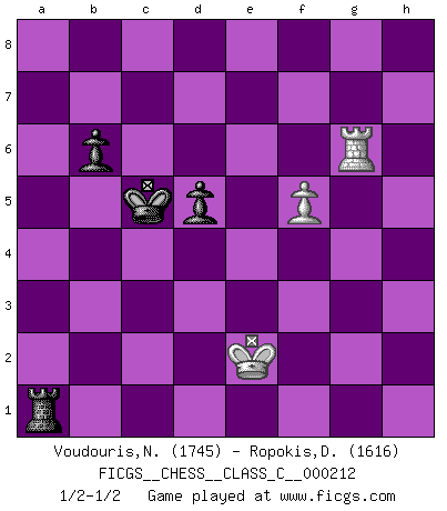 Last move : 1/2-1/2 2014 November 2 18:38:12 [Event "FICGS__CHESS__CLASS_C__000212"] [Site "FICGS"] [Date "2014.09.06"] [Round "1"] [White "Voudouris,Nick"] [Black "Ropokis,Dimitrios"] [Result "1/2-1/2"] [WhiteElo "1745"] [BlackElo "1616"] 1.d4 b6 2.f4 Bb7 3.e3 e6 4.Nf3 c5 5.c3 cxd4 6.exd4 Nf6 7.Bd3 Be7 8.Qe2 O-O 9.O-O d5 10.Nbd2 Nc6 11.Ne5 Bd6 12.b3 Rc8 13.Bb2 g6 14.Rf3 Ne7 15.Rh3 h5 16.Ndf3 Nf5 17.Ng5 Rc7 18.Nxg6 fxg6 19.Nxe6 Qe8 20.Nxc7 Qxe2 21.Bxe2 Bxc7 22.Rf3 Ne4 23.g3 Rf7 24.Bd3 h4 25.Kg2 hxg3 26.hxg3 Rg7 27.Bc1 Bc8 28.a4 Rh7 29.Ba3 Nexg3 30.Rxg3 Nxg3 31.Kxg3 Rh3+ 32.Kf2 Rxd3 33.Re1 Rxc3 34.Re8+ Kf7 35.Rxc8 Ke6 36.Bb4 Rxb3 37.Rxc7 Rxb4 38.Rxa7 Kf5 39.Rf7+ Ke4 40.Rf6 Kxd4 41.Rxg6 Kc5 42.Kf3 Rxa4 43.f5 Ra1 44.Ke2 1/2-1/2 Queen's pawn : English defense Kingside Castling by player Black (move 8) Kingside Castling by player White (move 9) 10 pieces endgame at move 38 : White KRPPP , Black KRPPP WHITE : King + 1 Rook 3 Pawns BLACK : King + 1 Rook 3 Pawns 9 pieces endgame at move 40 : White KRPP , Black KRPPP WHITE : King + 1 Rook 2 Pawns BLACK : King + 1 Rook 3 Pawns 8 pieces endgame at move 41 : White KRPP , Black KRPP WHITE : King + 1 Rook 2 Pawns BLACK : King + 1 Rook 2 Pawns 7 pieces endgame at move 42 : White KRP , Black KRPP WHITE : King + 1 Rook 1 Pawn BLACK : King + 1 Rook 2 Pawns This chess game ended in a draw. Follow this game move after move (download)Chess is a terrible game. If you have no center, your opponent has a freer position. If you do have a center, then you really have something to worry about ! (Siegbert Tarrasch) Die Jungen erwarten, dass Opa einfach umfällt. Dann aber kann Opa fünf Stunden lang Schach spielen und die jungen Gegner an die Wand drücken. (Viktor Kortschnoi) Los libros de Ajedrez deben de usarse igual como usamos los anteojos: para mejorar la vista, aunque algunos jugadores los quieren usar como si ellos les otorgaran la vision. (José Raúl Capablanca) D'abord les bases : Jouez et étudiez, puis étudiez et jouez, ensuite jouez et étudiez, puis étudiez et jouez. Deuxièmement : Donnez toujours le meilleur de vous-même ! (Ken Smith) Don't anthropomorphize computers - they hate it. (Anonymous)