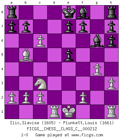 Last move : 1-0 2014 October 20 21:9:8 [Event "FICGS__CHESS__CLASS_C__000212"] [Site "FICGS"] [Date "2014.09.06"] [Round "1"] [White "Ilic,Slavisa"] [Black "Plunkett,Louis"] [Result "1-0"] [WhiteElo "1605"] [BlackElo "1661"] 1.e4 Nc6 2.Nf3 Nf6 3.e5 Ng4 4.d4 d6 5.h3 Nh6 6.Nc3 Bf5 7.g4 Bg6 8.d5 Nxe5 9.Nxe5 dxe5 10.Bxh6 gxh6 11.Bb5+ c6 12.dxc6 Qxd1+ 13.Rxd1 1-0 KP : Nimzovich defense Player White won this chess game. Follow this game move after move (download)You must take your opponent into a deep dark forest where 2+2=5, and the path leading out is only wide enough for one. (Mikhail Tal) Im Blitz ist es einfacher mit einer Figur weniger anzugreifen, als sich mit einer Mehrfigur zu verteidigen. (Mikhail Nekhemyevich Tal) Los finales de Peón son del Ajedrez lo que el cesped es del Golf. (Cecil Purdy) Toute estimation doit être constamment réévaluée. (Jacob Estrin) There are two types of people in this world, good and bad. The good sleep better, but the bad seem to enjoy the waking hours much more. (Woody Allen)