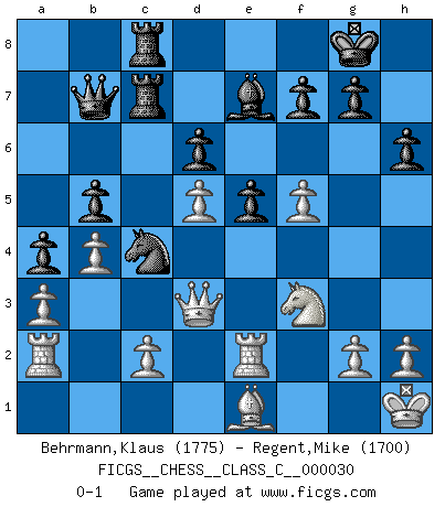 Last move : 0-1 2007 July 11 22:45:29 [Event "FICGS__CHESS__CLASS_C__000030"] [Site "FICGS"] [Date "2007.02.21"] [Round "1"] [White "Behrmann,Klaus"] [Black "Regent,Mike"] [Result "0-1"] [WhiteElo "1775"] [BlackElo "1700"] 1.Nf3 a6 2.e4 c5 3.d4 cxd4 4.Nxd4 d6 5.Nc3 Nf6 6.f4 e5 7.Nf3 Nbd7 8.Bc4 Be7 9.f5 b5 10.Bd5 Rb8 11.a3 Bb7 12.Bxb7 Rxb7 13.Be3 Nb6 14.O-O O-O 15.Qd3 Nc4 16.Bc1 Qb6+ 17.Kh1 Qc5 18.b3 Nb6 19.Be3 Qc6 20.Rfd1 Rc8 21.Bd2 Nbd7 22.Re1 a5 23.b4 a4 24.Ra2 h6 25.Re2 Nb6 26.Kg1 Nc4 27.Nd5 Nxd5 28.exd5 Qb6+ 29.Kh1 Rbc7 30.Be1 Qb7 0-1 Reti Opening Kingside Castling by player White (move 14) Kingside Castling by player Black (move 14) Player Black won this chess game. Follow this game move after move (download)Play the opening like a book, the middle game like a magician, and the endgame like a machine. (Spielmann) Moralische Siege zählen nicht. (Savielly Grigorievitsch Tartakower) ¿Cual es el objetivo de jugar una apertura de gambito?... Para adquirir una reputación de ser un jugador apuesto a costo de perder el juego. (Siegbert Tarrasch) Les ravages du H expliquent la différence de niveau entre Tal et Thal [Abergel]. The only thing that matters is the evidence. (Horatio Caine, C.S.I. Miami)