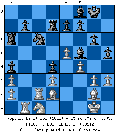 Last move : 0-1 2015 April 27 8:37:26 [Event "FICGS__CHESS__CLASS_C__000212"] [Site "FICGS"] [Date "2014.09.06"] [Round "1"] [White "Ropokis,Dimitrios"] [Black "Ethier,Marc"] [Result "0-1"] [WhiteElo "1616"] [BlackElo "1605"] 1.Nc3 d5 2.e4 c6 3.g3 g6 4.Bg2 d4 5.Nce2 c5 6.d3 Bg7 7.f4 Nc6 8.Nf3 Nf6 9.c3 O-O 10.O-O Qb6 11.cxd4 cxd4 12.Qb3 Nd7 13.e5 Rd8 14.Qc4 Nc5 15.Ng5 Ne6 16.Ne4 Bd7 17.Bd2 a5 18.Qb3 Qa6 19.Rac1 a4 20.Qa3 Bf8 21.Rc2 Nc7 22.Nc5 Nb5 23.Nxa6 Nxa3 24.bxa3 Rxa6 25.Rb1 Bf5 26.Nc1 Rd7 27.h3 h5 0-1 This chess game has been lost on time (started : 2014.09.06 12:9:19) Dunst (Sleipner, Heinrichsen) Opening Kingside Castling by player Black (move 9) Kingside Castling by player White (move 10) Player Black won this chess game. Follow this game move after move (download)The essence of Chess is thinking about what Chess is. (David Bronstein) Ich könnte leicht behaupten: Ja,ja, Leonid Breschnew wollte nicht, daß ich Weltmeister werde. In der Tat war die Sache komplizierter. (Viktor Kortschnoi) Bobby solo arroja las piezas y solas caen en las casillas correctas. (Miguel Najdorf ) Les réformistes prétendent que les progrès de la théorie conduiront à la disparition des échecs, et qu'il faut, pour leur rendre vie, en remanier les règles. En réalité, qu'exprime cette affirmation? Le mépris de l'intuition, de l'imagination et de tous les autres éléments qui font des échecs un art. (Alexander Alekhine) Train yourself to let go of everything you fear to lose. (Master Yoda in Star Wars ep.3)